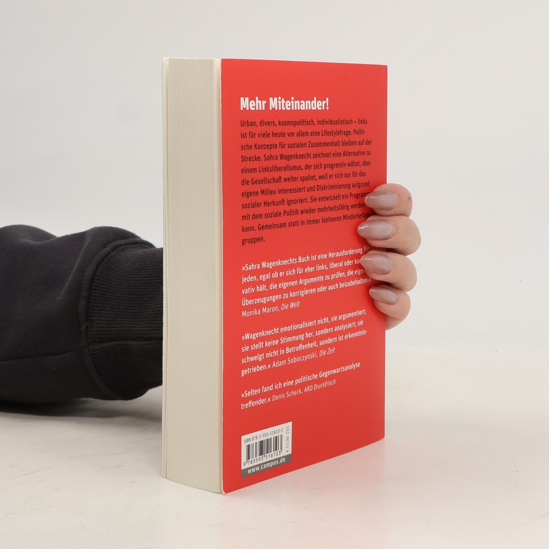 Urban, divers, kosmopolitisch, individualistisch – links ist für viele heute vor allem eine Lifestylefrage. Politische Konzepte für sozialen Zusammenhalt bleiben auf der Strecke. Sahra Wagenknecht zeichnet eine Alternative zu einem Linksliberalismus, der sich progressiv wähnt, aber die Gesellschaft weiter spaltet, weil er sich nur für das eigene Milieu interessiert und Diskriminierung aufgrund sozialer Herkunft ignoriert. Sie entwickelt ein Programm, mit dem soziale Politik wieder mehrheitsfähig werden kann. Gemeinsam statt in immer kleineren Minderheitengruppen. »Sahra Wagenknechts Buch ist eine Herausforderung für jeden, egal ob er sich für eher links, liberal oder konservativ hält, die eigenen Argumente zu prüfen, die eigenen Überzeugungen zu korrigieren oder auch beizubehalten.« Monika Maron, Die Welt »Wagenknecht emotionalisiert nicht, sie argumentiert; sie stellt keine Stimmung her, sondern analysiert; sie schwelgt nicht in Betroffenheit, sondern ist erkenntnisgetrieben.« Adam Soboczynski, Die Zeit »Selten fand ich eine politische Gegenwartsanalyse treffender.« Denis Scheck, ARD Druckfrisch