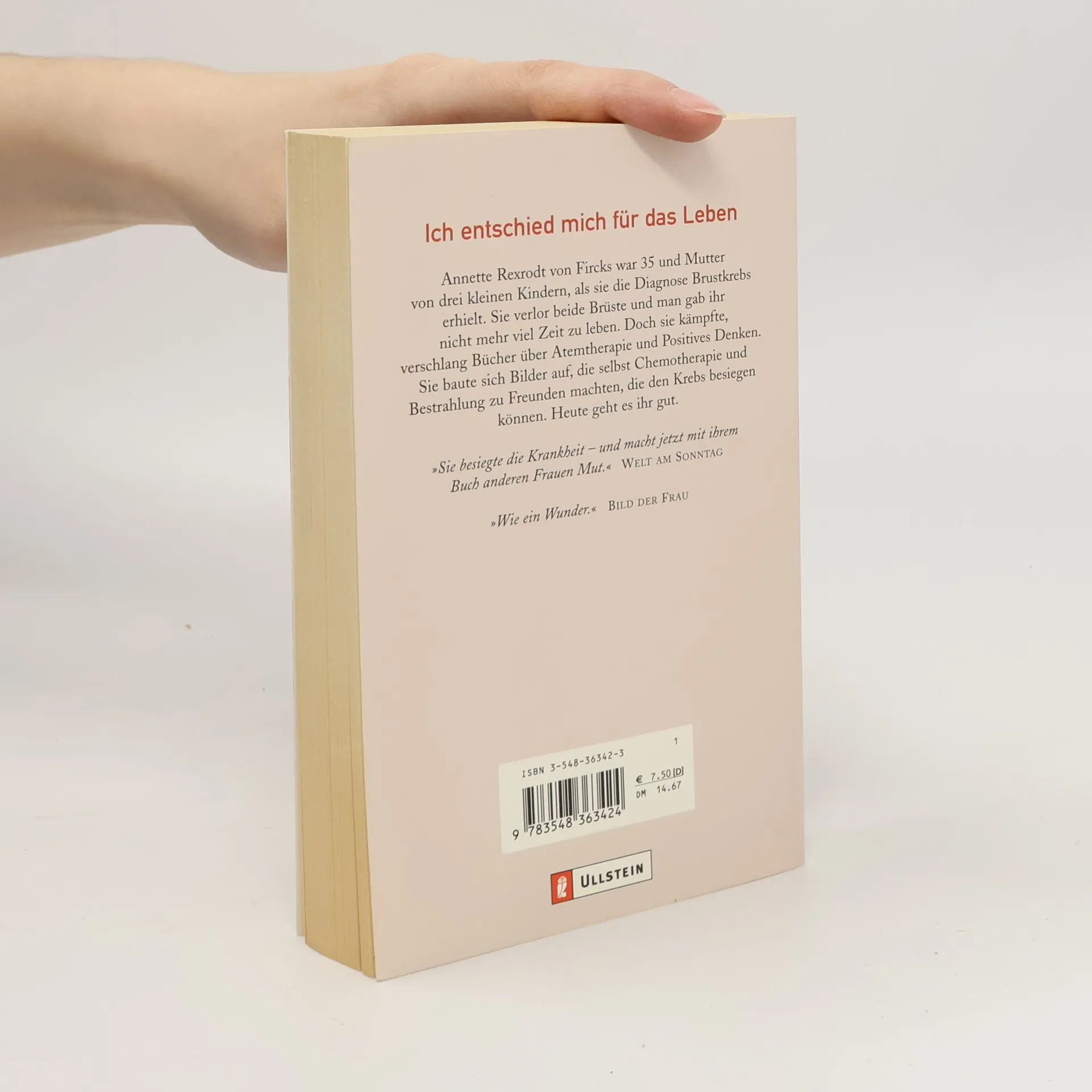 „Ich entschied mich fürs das Leben“ Annette Rexrodt von Fircks war 35 und Mutter von drei kleinen Kindern, als sie die Diagnose Brustkrebs erhielt. Sie verlor beide Brüste und man gab ihr nicht mehr viel Zeit zu leben. Doch sie kämpfte, verschlang Bücher über Atemtherapie und Positives Denken. Sie baute sich Bilder auf, die selbst Chemotherapie und Bestrahlung zu Freunden machten, die den Krebs besiegen können. Heute geht es ihr gut.