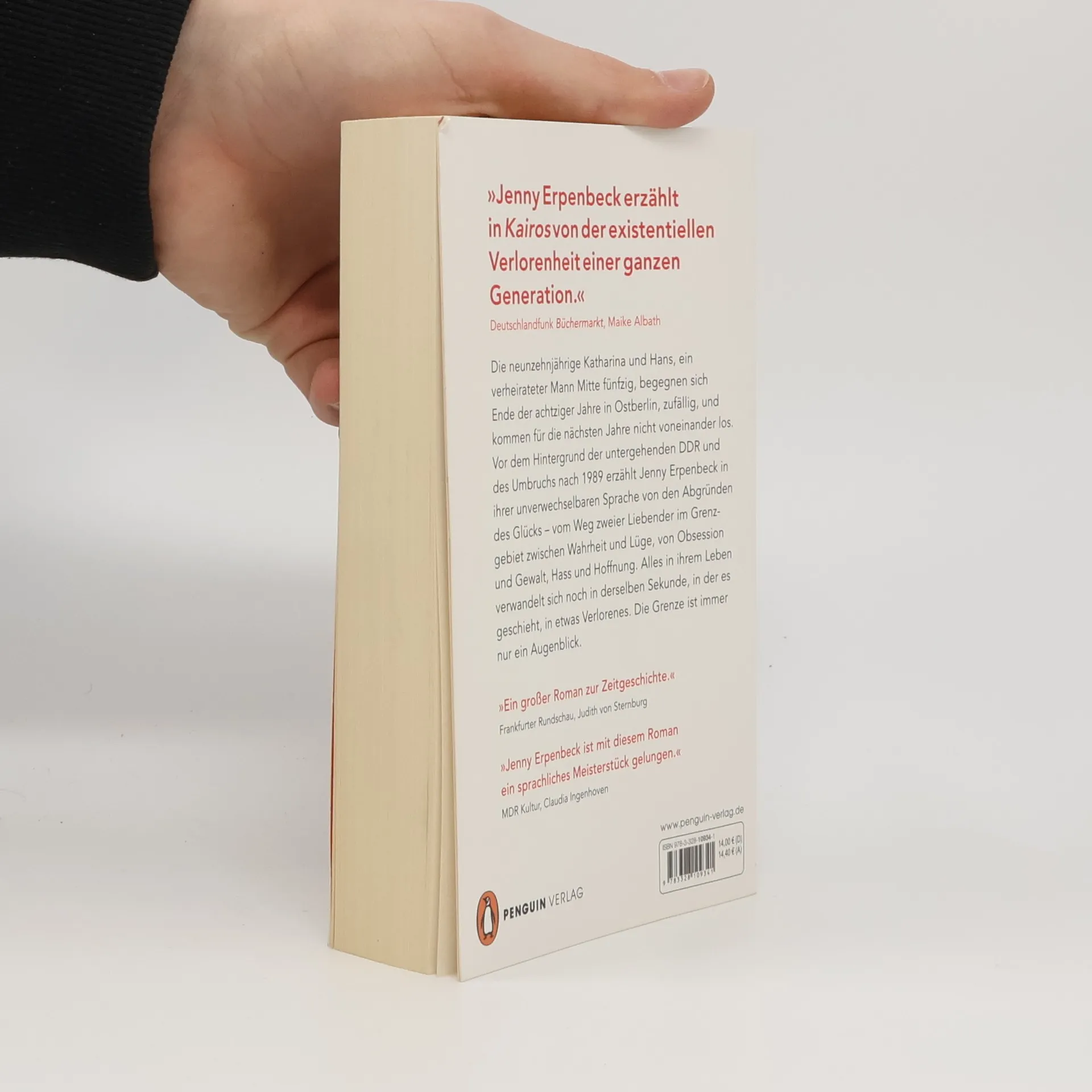 »Eine der größten lebenden Erzählerinnen, die (nicht nur) wir haben.« Andreas Platthaus, FAZ Die neunzehnjährige Katharina und Hans, ein verheirateter Mann Mitte fünfzig, begegnen sich Ende der achtziger Jahre in Ostberlin, zufällig, und kommen für die nächsten Jahre nicht voneinander los. Vor dem Hintergrund der untergehenden DDR und des Umbruchs nach 1989 erzählt Jenny Erpenbeck in ihrer unverwechselbaren Sprache von den Abgründen des Glücks – vom Weg zweier Liebender im Grenzgebiet zwischen Wahrheit und Lüge, von Obsession und Gewalt, Hass und Hoffnung. Alles in ihrem Leben verwandelt sich noch in derselben Sekunde, in der es geschieht, in etwas Verlorenes. Die Grenze ist immer nur ein Augenblick. »Erpenbecks beklemmende Entfaltung einer Amour fou, die mit dem Untergang des Staates synchronisiert wird, entwickelt einen beispiellosen Sog. Es ist ein großer, schöner und grausamer Liebesroman, der zu Recht ausgezeichnet worden ist.« Adam Soboczynski, Die Zeit »Jenny Erpenbeck erzählt in ›Kairos‹ von der existentiellen Verlorenheit einer ganzen Generation.« Maike Albath, Deutschlandfunk ›Büchermarkt‹ »Erpenbeck demonstriert in ›Kairos‹ ihre sprachlichen und literarischen Qualitäten.« Gerrit Bartels, Tagesspiegel