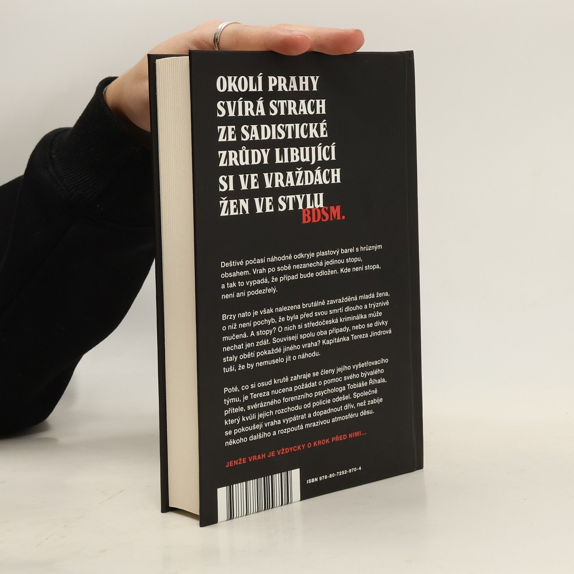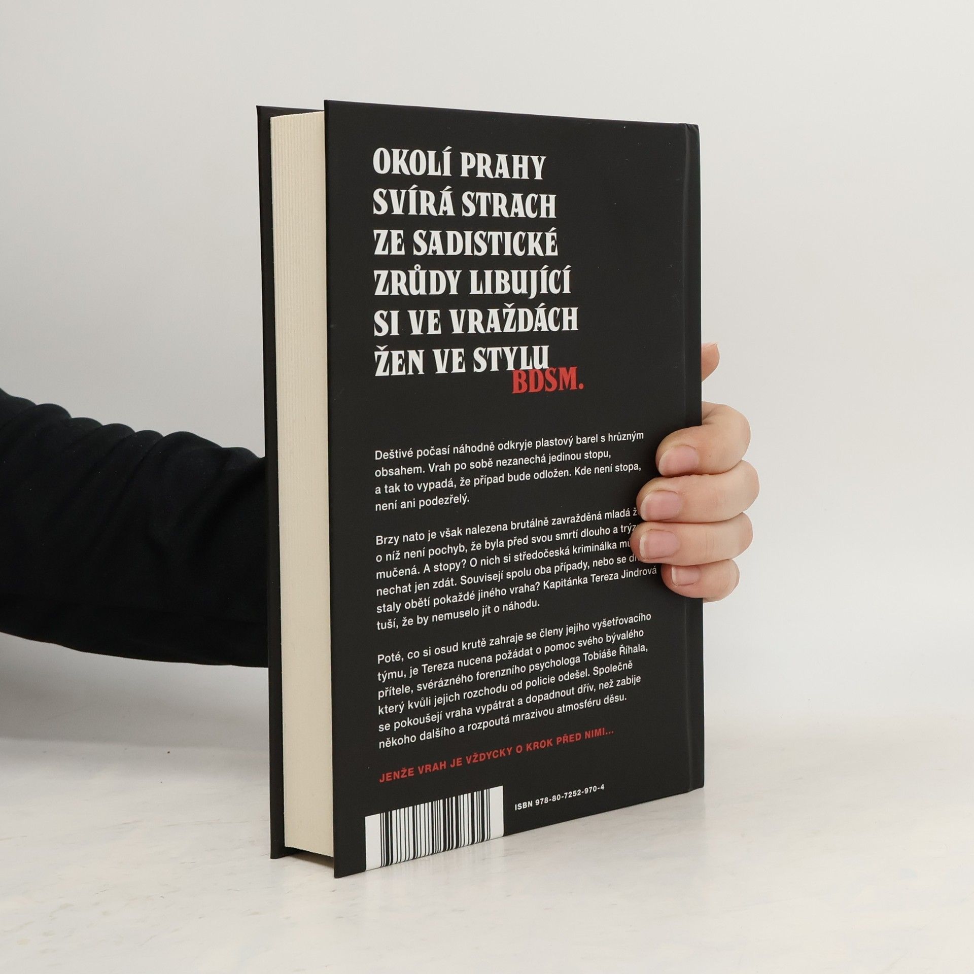 Zvrácenost, s jakou sériový vrah zabíjí mladé dívky, nikdo nepamatuje OKOLÍ PRAHY SVÍRÁ STRACH ZE SADISTICKÉ ZRŮDY LIBUJÍCÍ SI VE VRAŽDÁCH ŽEN VE STYLU BDSM. Deštivé počasí náhodně odkryje plastový barel s hrůzným obsahem. Vrah po sobě nezanechá jedinou stopu, a tak to vypadá, že případ bude odložen. Kde není stopa, není ani podezřelý. Brzy nato je však nalezena brutálně zavražděná mladá žena, o níž není pochyb, že byla před svou smrtí dlouho a trýznivě mučená. A stopy? O nich si středočeská kriminálka může nechat jen zdát. Souvisejí spolu oba případy, nebo se dívky staly obětí pokaždé jiného vraha? Kapitánka Tereza Jindrová tuší, že by nemuselo jít o náhodu. Poté, co si osud krutě zahraje se členy jejího vyšetřovacího týmu, je Tereza nucena požádat o pomoc svého bývalého přítele, svérázného forenzního psychologa Tobiáše Říhala, který kvůli jejich rozchodu od policie odešel. Společně se pokoušejí vraha vypátrat a dopadnout dřív, než zabije někoho dalšího a rozpoutá mrazivou atmosféru děsu. Jenže vrah je vždycky o krok před nimi...