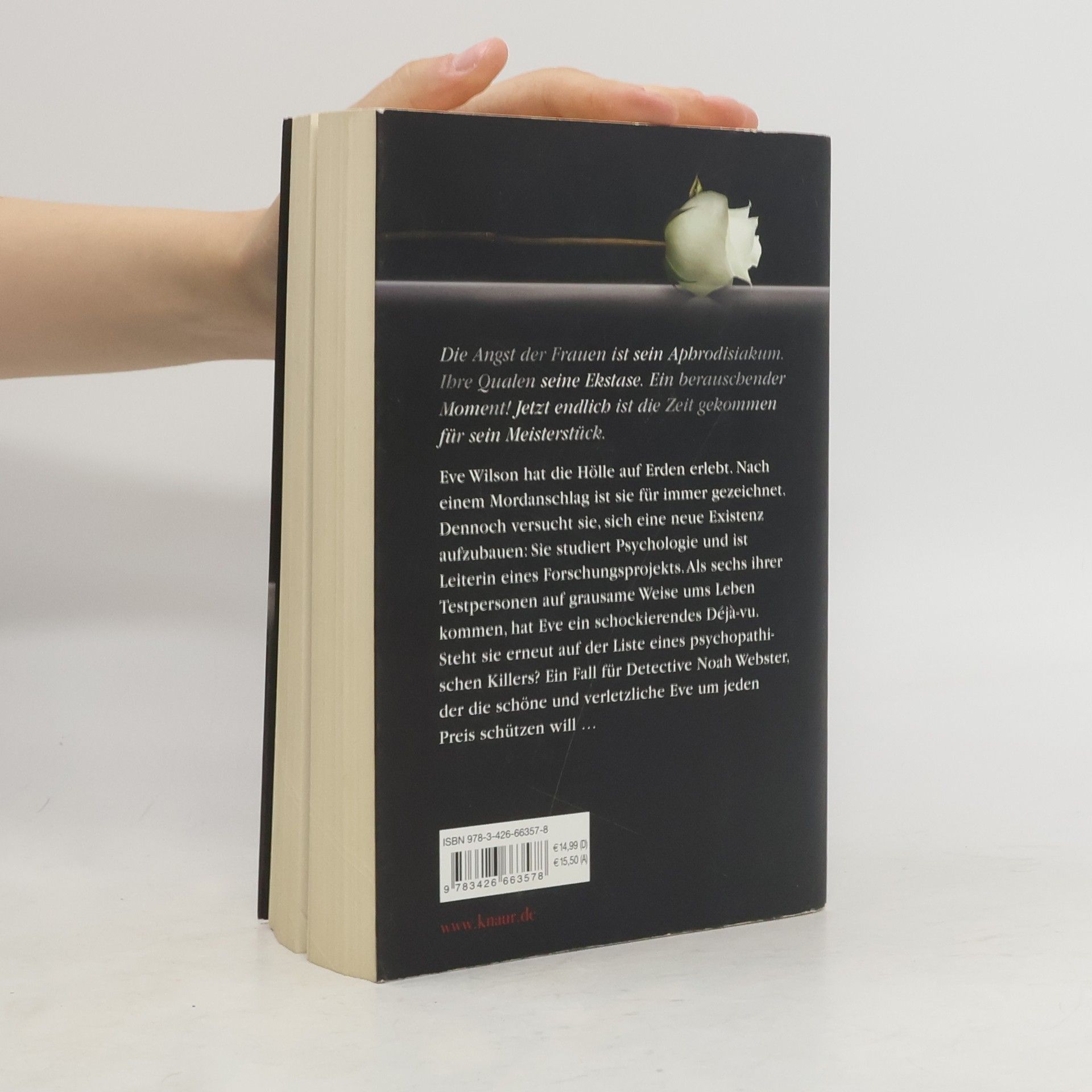 Die Angst der Frauen ist sein Aphrodisiakum. Ihre Qualen seine Ekstase. Ein berauschender Moment! Jetzt endlich ist die Zeit gekommen für sein Meisterstück. Eve Wilson hat die Hölle auf Erden erlebt. Nach einem Mordanschlag ist sie für immer gezeichnet. Dennoch versucht sie, sich eine neue Existenz aufzubauen: Sie studiert Psychologie und ist Leiterin eines Forschungsprojekts. Als sechs ihrer Testpersonen auf grausame Weise ums Leben kommen, hat Eve ein schockierendes Déjà-vu. Steht sie erneut auf der Liste eines psychopathischen Killers? Ein Fall für Detective Noah Webster, der die schöne und verletzliche Eve um jeden Preis schützen will …