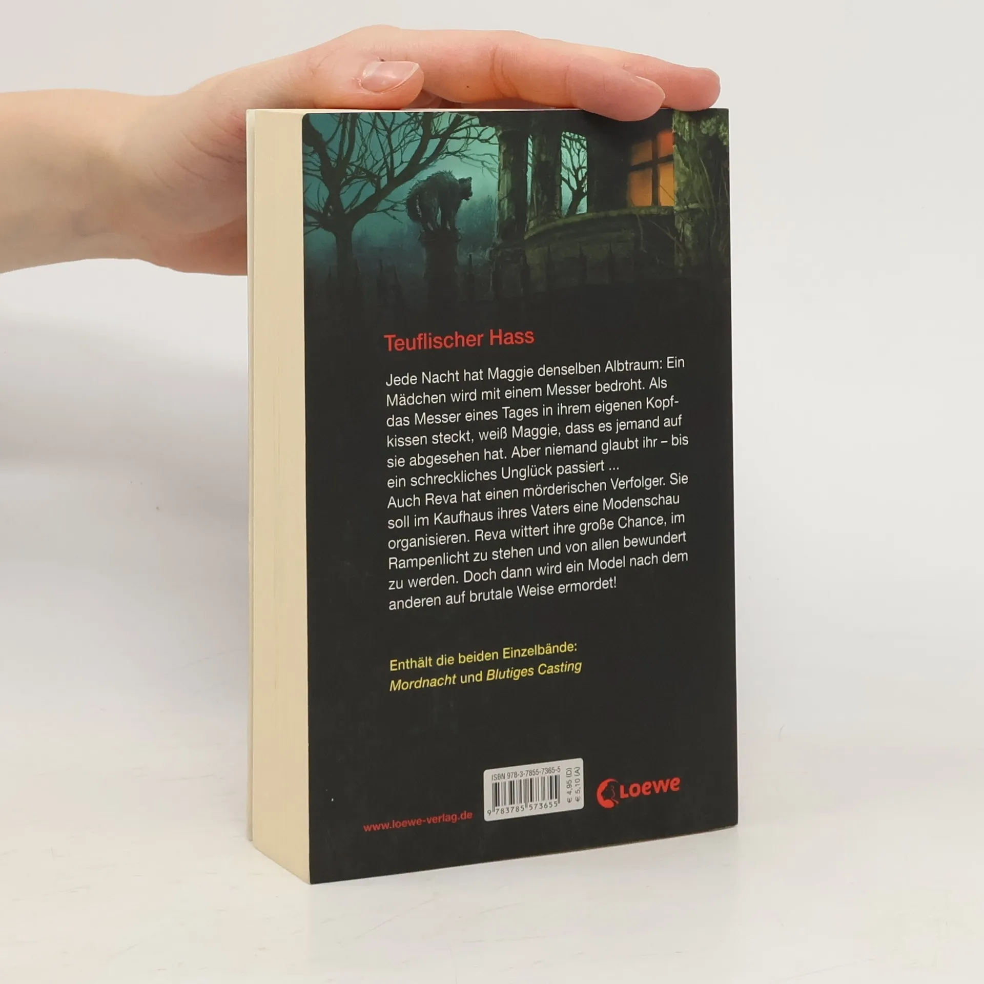 Jede Nacht hat Maggie denselben Albtraum: Ein Mädchen wird mit einem Messer bedroht. Als das Messer eines Tages in ihrem eigenen Kopfkissen steckt, weiß Maggie, dass es jemand auf sie abgesehen hat. Aber niemand glaubt ihr - bis ein schreckliches Unglück passiert. Auch Reva hat einen mörderischen Verfolger. Sie soll im Kaufhaus ihres Vaters eine Modenschau organisieren. Reva wittert ihre große Chance, im Rampenlicht zu stehen und von allen bewundert zu werden. Doch dann wird ein Models nach dem anderen auf brutale Weise ermordet! Enthält die beiden Einzelbände „Mordnacht“ und „Blutiges Casting“