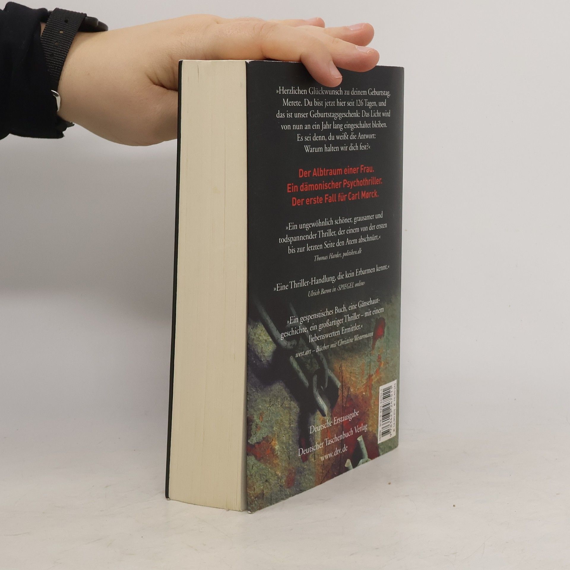 Und dann kam die Angst wie ein schleichendes Gift. Der Albtraum einer Frau.Ein dämonischer Psychothriller.Der erste Fall für Carl Mørckvom Sonderdezernat Q in Kopenhagen. Die verzerrte Stimme kam aus einem Lautsprecher irgendwo im Dunklen: »Herzlichen Glückwunsch zu deinem Geburtstag, Merete. Du bist jetzt hier seit 126 Tagen, und das ist unser Geburtstagsgeschenk: Das Licht wird von nun an ein Jahr lang eingeschaltet bleiben. Es sei denn, du weißt die Antwort: Warum halten wir dich fest?« Am 2. März 2002 verschwindet eine Frau spurlos auf der Fähre von Rødby nach Puttgarden, man vermutet Tod durch Ertrinken. Doch sie ist nicht tot, sondern wird in einem Gefängnis aus Beton gefangen gehalten. Wer sind die Täter? Was wollen sie von dieser Frau? Und: Kann ein Mensch ein solches Martyrium überleben? ››Ein ungewöhnlich schöner und hochspannender Thriller, der einem bis zur letzten Seite den Atem abschnürt.‹‹ politiken. dk Trailer ansehen auf www. adler-olsen. de