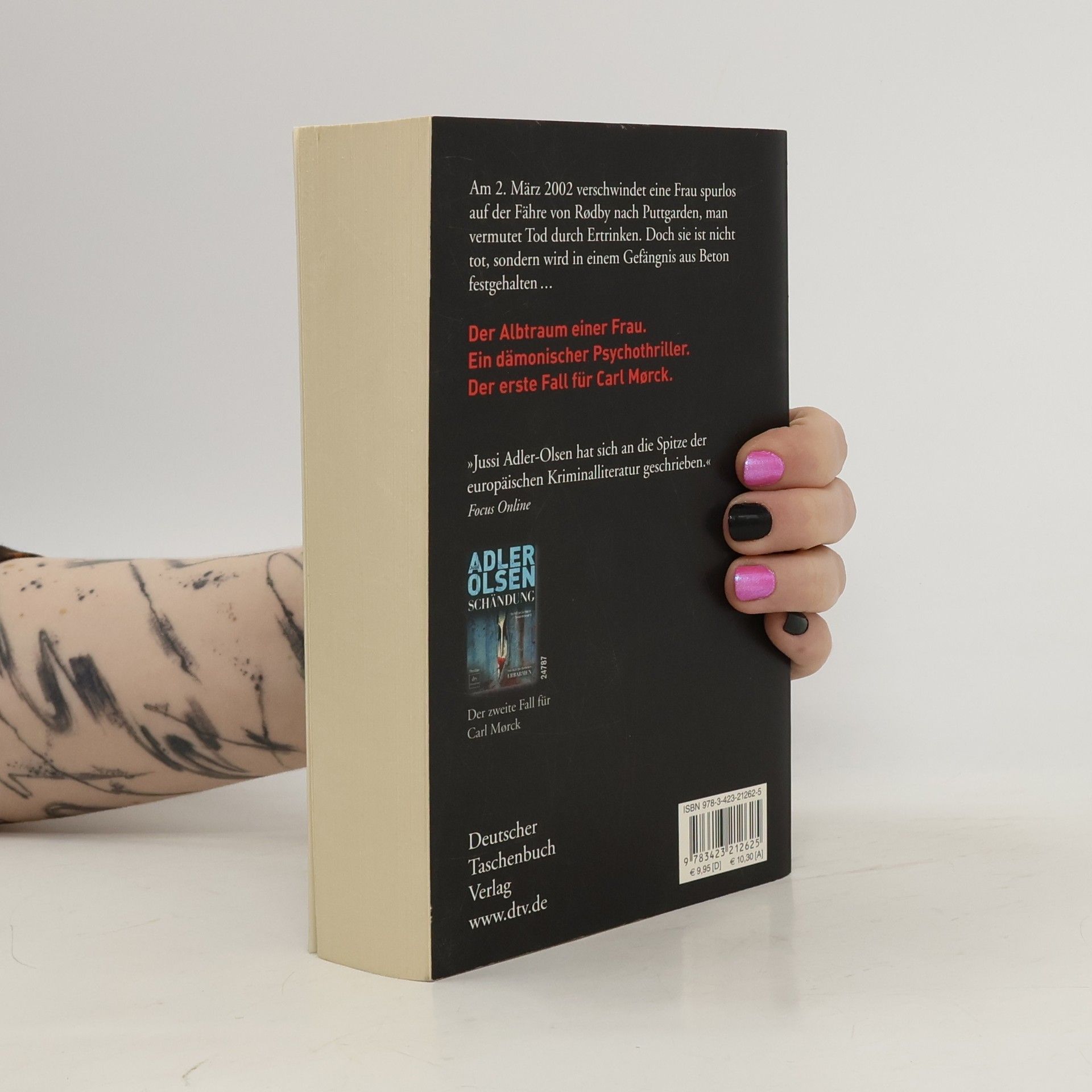 Ein dämonischer Psychothriller und der erste Fall für Carl Mørck vom Sonderdezernat Q für unaufgeklärte Morde der Kopenhagener Polizei. Am 2. März 2002 verschwindet eine Frau auf der Fähre von Rødby nach Puttgarden, und man vermutet, dass sie ertrunken ist. Doch sie lebt und wird in einem Betonverlies gefangen gehalten. Carl Mørck, der neu ernannte Spezialermittler, ist anfangs wenig begeistert von seinem Job, da die Erfolgsquote bei Cold Cases schlecht ist. Sein syrischer Assistent Hafez el-Assad hingegen ist hochmotiviert und entschlossen, den Fall der verschwundenen Politikerin zu lösen. Unbemerkt von ihnen beginnt ein atemloser Wettlauf gegen die Zeit. Der erste Band der Spiegel-Bestseller-Reihe um Carl Mørck und seinen unkonventionellen Assistenten Assad überrascht mit spannenden Wendungen und einem packenden Erzählstil. Kritiker loben das Buch als hart und atmosphärisch dicht, sowie als einen außergewöhnlich spannenden Thriller, der bis zur letzten Seite fesselt. Jussi Adler-Olsen wird mit seiner Erzählweise mit Größen wie Dean Koontz und Stieg Larsson verglichen und begeistert Leser mit seiner Fähigkeit, die Ermittlungen rasant voranzutreiben. Neben der Carl-Mørck-Reihe sind auch weitere Titel des Autors bei dtv erschienen.