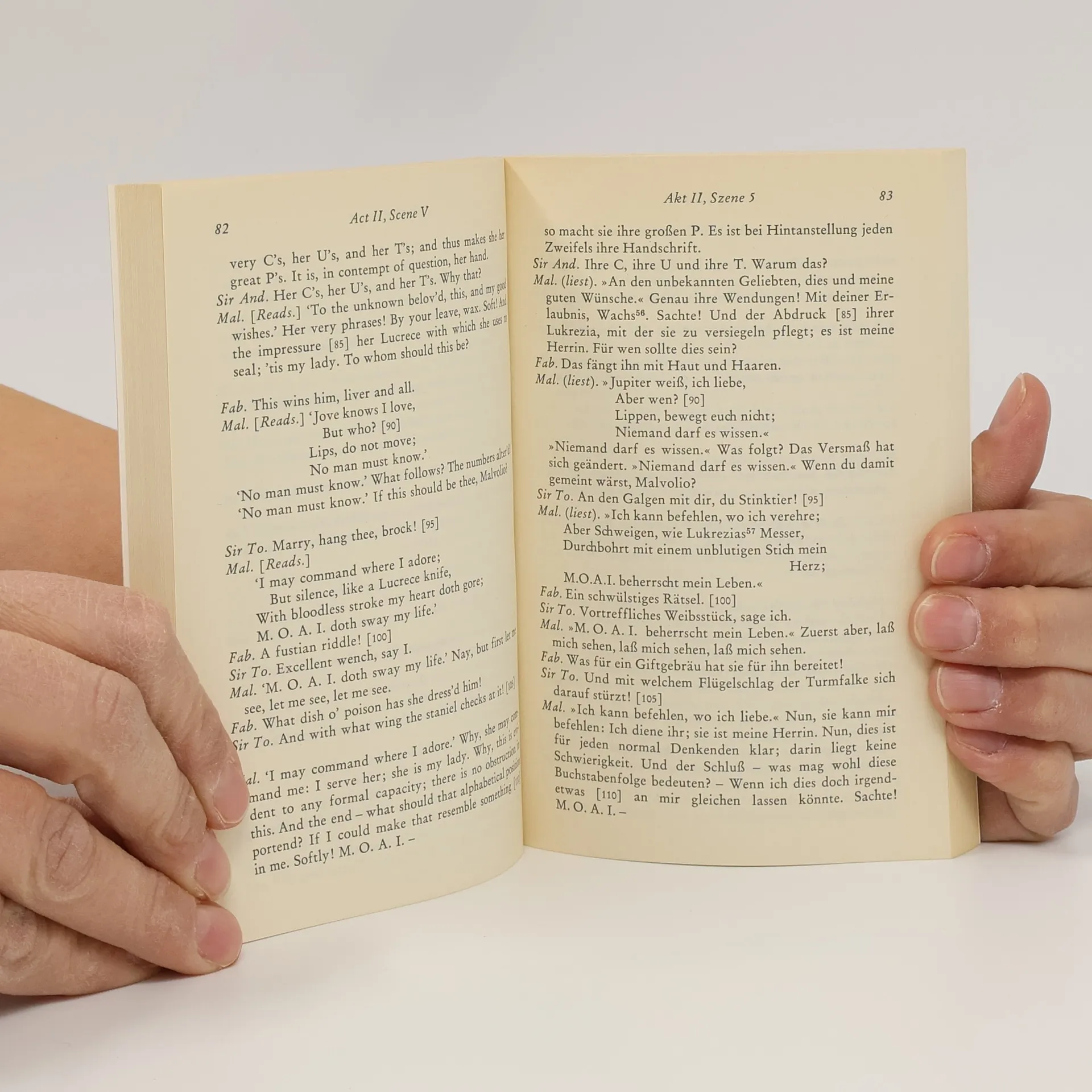 Band 8. Komödie. Nach einem Schiffbruch landet Viola in Illyrien, getrennt von ihrem Bruder Sebastian. Sie verkleidet sich als Page und tritt in den Dienst von Herzog Orsino unter dem Namen Cesario. Orsino, der in Olivia verliebt ist, schickt Cesario als Boten zu ihr. Während Viola sich in den Herzog verliebt, leidet sie unter den Botengängen, da Olivia Orsino abweist und sich stattdessen in den vermeintlichen Jüngling Cesario verliebt. Die Situation eskaliert, als Sebastian, der Viola zum Verwechseln ähnlich sieht, auftaucht. Während Cesario Olivia abweist, willigt Sebastian, überrascht und erfreut, in ihre Liebeswerbung ein und heiratet sie. Sebastian gerät in ein Abenteuer mit Olivias Onkel, Junker Tobias von Rülp, und dem einfältigen Junker Bleichenwang, die ihn für Cesario halten. In der Zwischenzeit beschuldigt Olivia Cesario des ehewidrigen Verhaltens, während Cesario seine Liebe zu Orsino gesteht. Sebastians Erscheinen klärt die Missverständnisse, die Geschwister erkennen sich, und schließlich finden Olivia mit Sebastian sowie Viola alias Cesario und der Herzog zueinander. Begleitet wird die Handlung von dem melancholischen Narren Feste, der auch an einem Streich gegen den hochnäsigen Malvolio beteiligt ist, der sich lächerlich macht und letztlich auf Rache sinnt. Zweisprachige Ausgabe mit Anmerkungen des Übersetzers und einem einführenden Essay von Christa Jansohn.