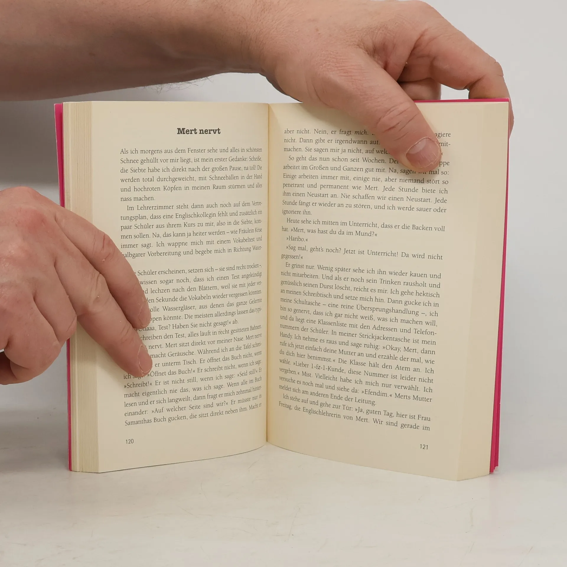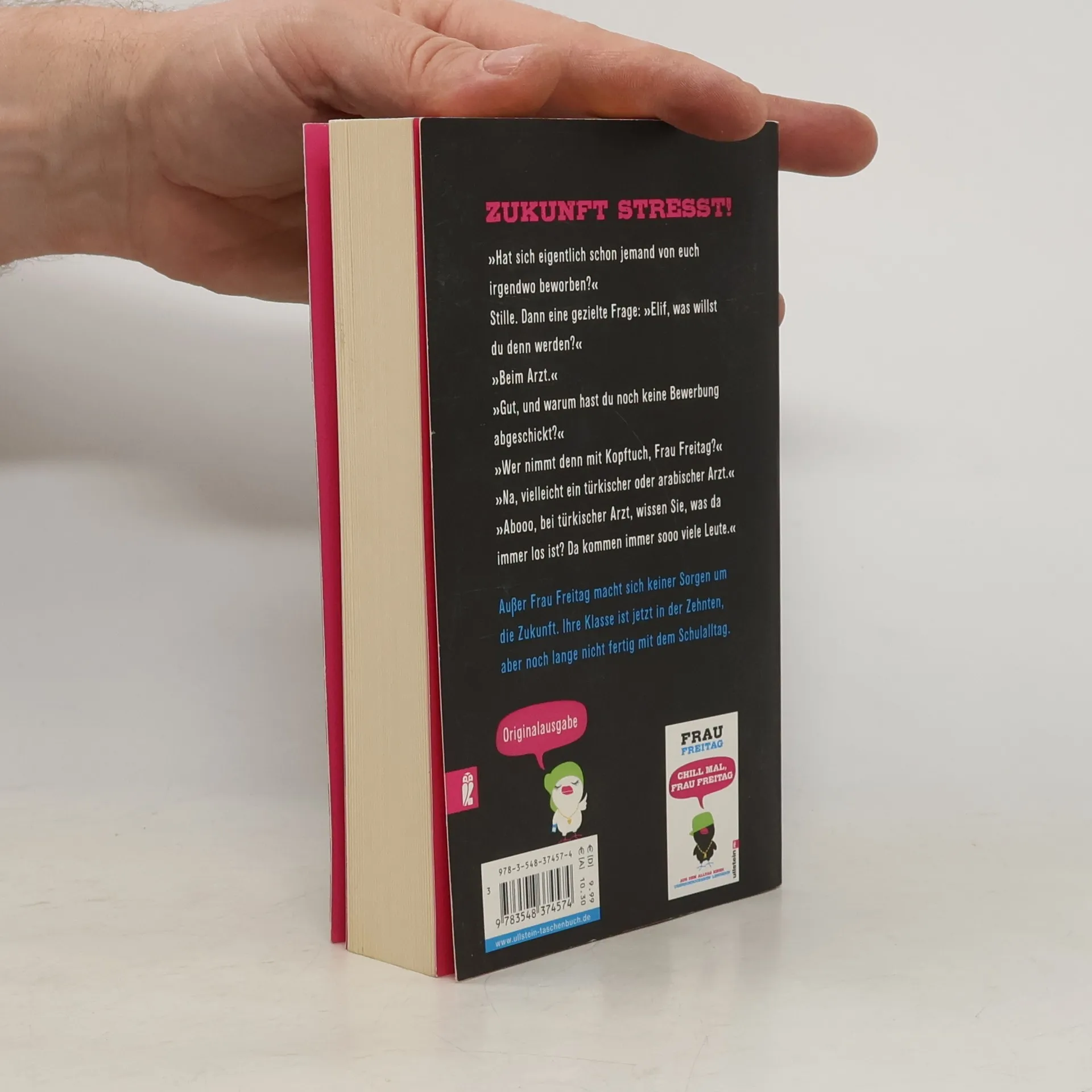 »Ich schwöre, ich habe perfekt deutsch gesprochen. Ich glaube, ich habe sogar gesagt: Ich habe mein Praktikum absolviert. So spreche ich sonst nie. «Frau Freitags Klasse ist jetzt in der Zehnten. Alles dreht sich um den Abschluss. Wirklich alles? Während Frau Freitag ihre Schüler nachts auf Facebook an ihre Bewerbungen erinnert und tagsüber durch die Prüfungen schleust, haben Bilal, Emre und Mariam ganz andere Probleme: »Wie kam man eigentlich ins Internet, als es noch keine Computer gab?« – »Moment noch Frau Freitag, gleich fertig mit Handy.« – »Hab ich Selbstbräuner raufgesprüht und heute Morgen voll Schock: volldunkelbraun.« Aber wie soll eigentlich Frau Freitag ohne ihre Klasse überleben?
