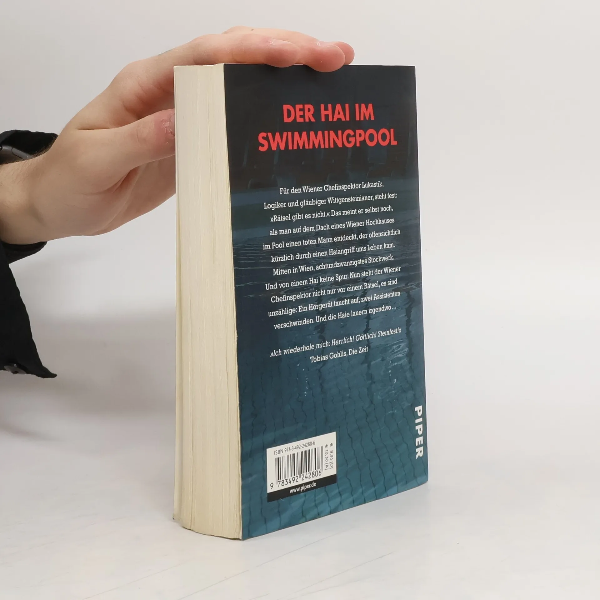 Für den Wiener Chefinspektor Lukastik, Logiker und gläubiger Wittgensteinianer, steht fest: »Rätsel gibt es nicht.« Das meint er selbst noch, als er auf dem Dach eines Wiener Hochhauses im Pool einen toten Mann entdeckt, der offensichtlich kürzlich durch einen Haiangriff ums Leben kam. Mitten in Wien, 28. Stockwerk. Und von einem Hai keine Spur. Nun steht der Wiener Chefinspektor nicht nur vor einem Rätsel, es sind unzählige: Ein Hörgerät taucht auf, zwei Assistenten verschwinden. Und die Haie lauern irgendwo …