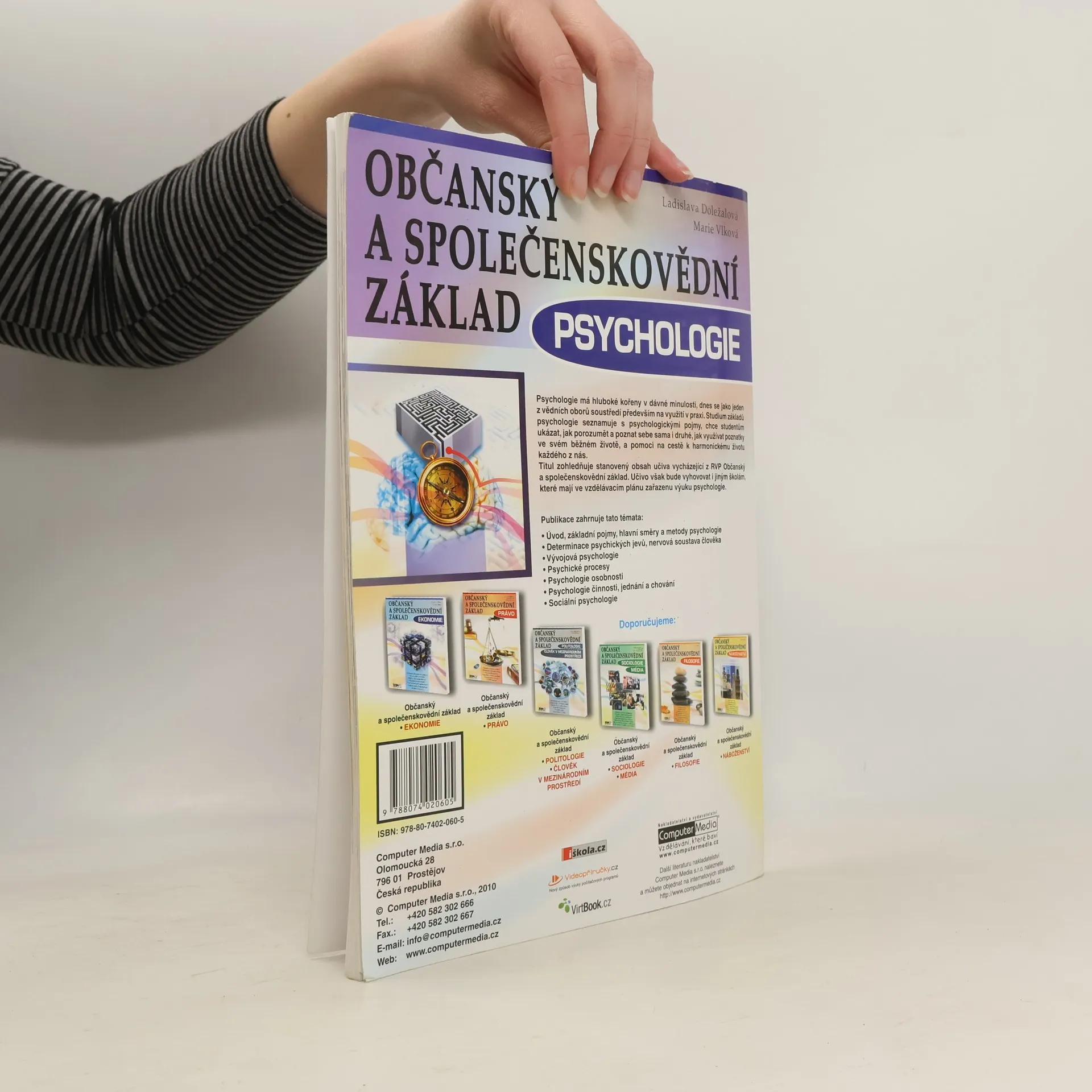 Učebnice psychologie komplexně pokrývá učivo předmětu psychologie na středních školách. Zabývá se psychickými procesy, psychologií poznání, psychologií osobnosti, vývojovou psychologií i sociální psychologií. Pomůže pochopit principy představivosti či myšlení, vysvětlí pojem inteligence i podstatu jejího měření, seznámí s fungováním paměti a v neposlední řadě zavede i do světa citů. Kniha rovněž objasní pohled na jednotlivce jako osobnost, zdůvodní různá chování a vlastnosti jednotlivce a dotkne se i duševních poruch. Učebnice plně odpovídá osnovám předmětu Psychologie ze vzdělávacího programu Občanský a společenskovědní základ.