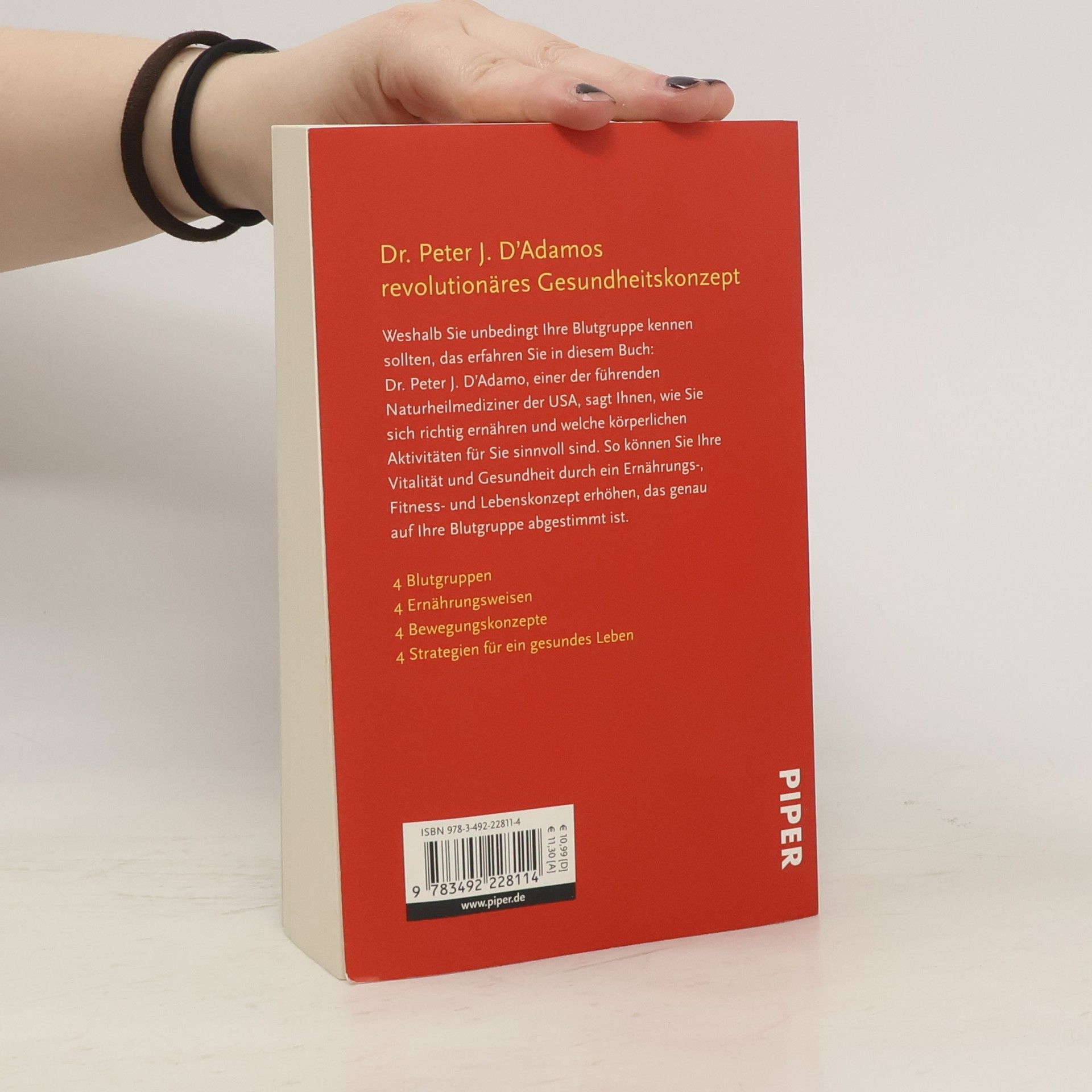 Weshalb Sie unbedingt Ihre Blutgruppe kennen sollten, das erfahren Sie in diesem Buch: Dr. Peter J. D’Adamo, einer der führenden Naturheilmediziner der USA, sagt Ihnen, wie Sie sich richtig ernähren und welche körperlichen Aktivitäten für Sie sinnvoll sind. So können Sie Ihre Vitalität und Gesundheit durch ein Ernährungs-, Fitness- und Lebenskonzept erhöhen, das genau auf Ihre Blutgruppe abgestimmt ist: 4 Blutgruppen, 4 Ernährungsweisen, 4 Bewegungskonzepte, 4 Strategien für ein gesundes Leben.