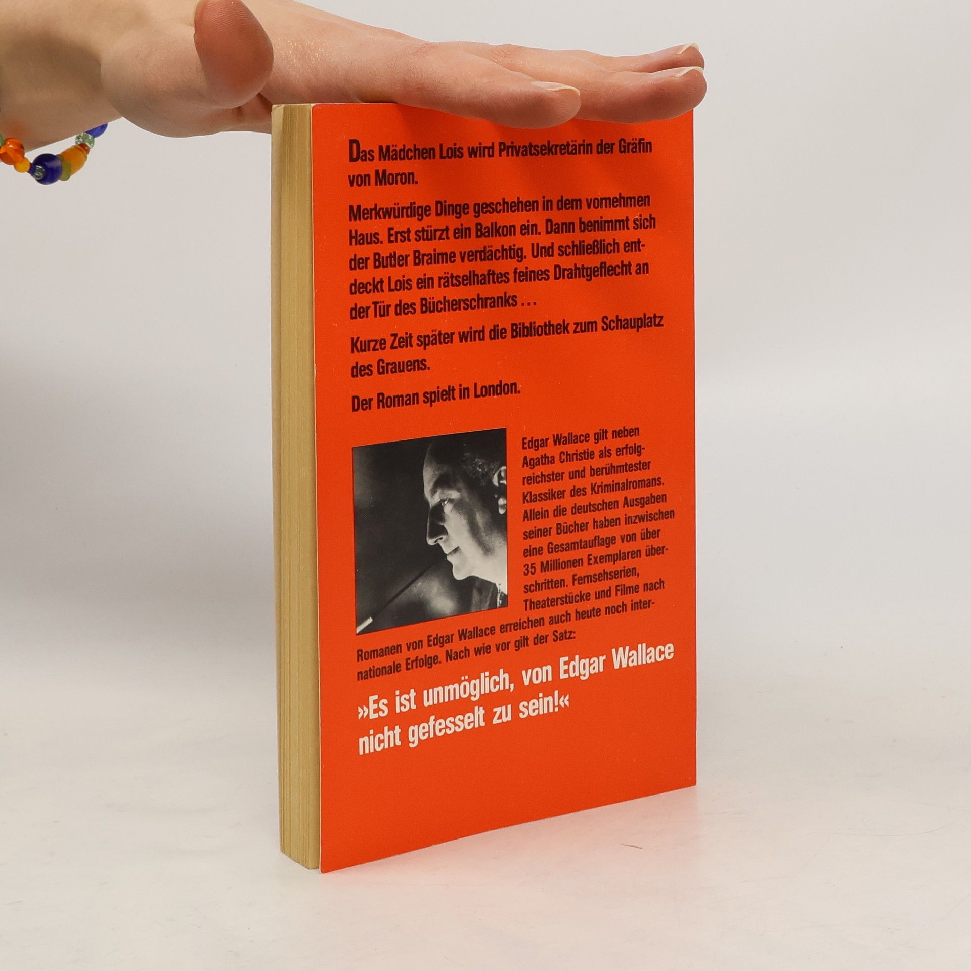 Richard Horatio Edgar Wallace (1875-1932) war ein englischer Schriftsteller, Drehbuchautor, Regisseur, Journalist und Dramatiker. Er gehört heute noch zu den erfolgreichsten englischsprachigen Kriminalschriftstellern. Als die junge Lois Reddle das Angebot bekommt, als Privatsekretärin für die Gräfin von Moron zu arbeiten, kann sie ihr Glück kaum fassen. Doch schon bald geschehen merkwürdige Dinge in dem Haus der Gräfin. Schließlich stürzt sogar ein Balkon in die Tiefe und in der Bibliothek passiert ein Mord. Ist eine der sehr merkwürdigen Personen im Umfeld der Gräfin der Mörder?