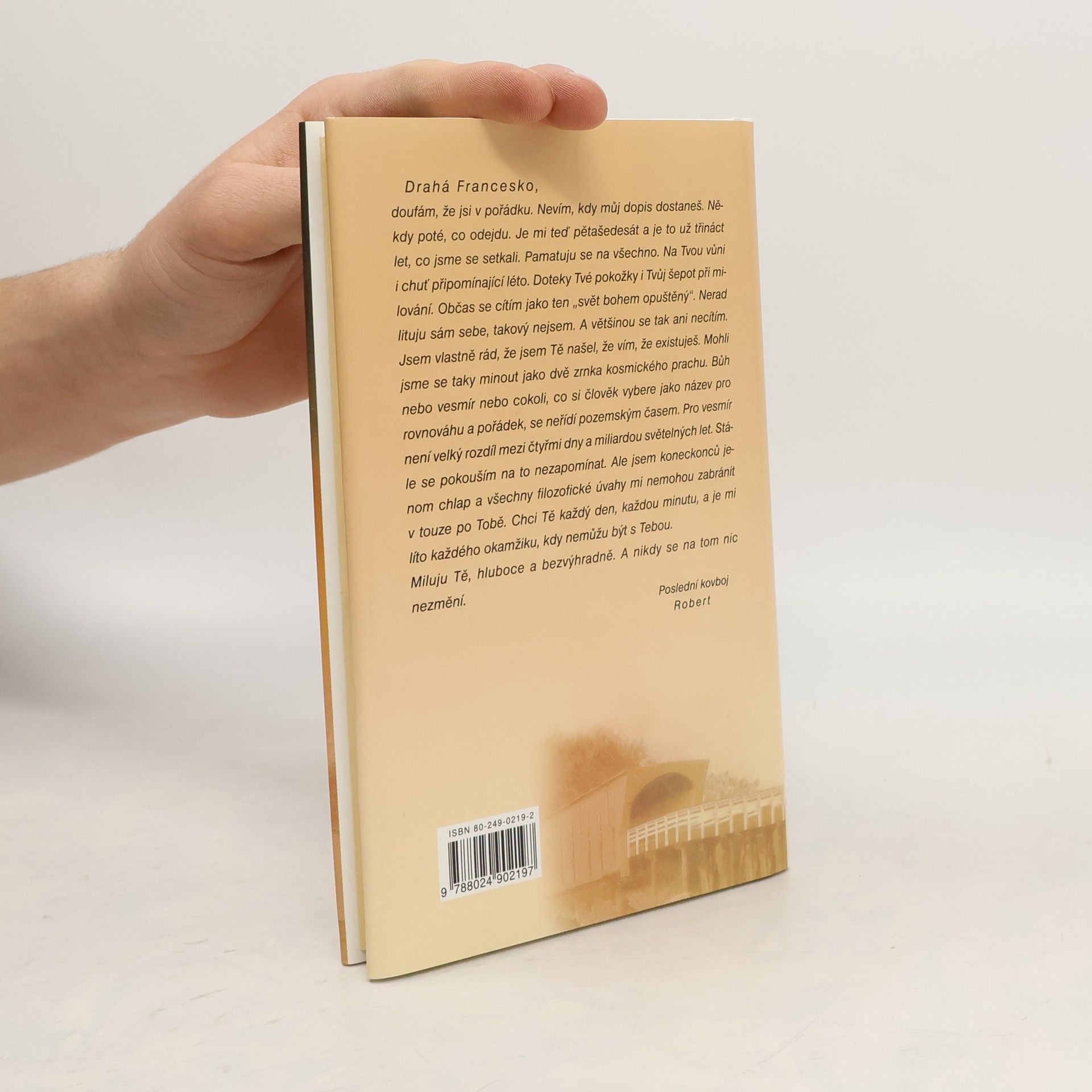 Robert Kincaid, fotograf, trochu bohém a "potulný kovboj", konečně ve svých 52 letech potkal životní lásku. Když pořizoval snímky zastřešených mostů v okresu Madison, zastavil u domku Francesky Johnsonové, ženy místního farmáře a vzorné matky dvou dětí. Byla doma sama, manžel a děti na týden odcestovali. Poklidný Francesčin život vybočí ze zaběhnutých kolejí. Kouzlo vzájemné přitažlivosti zasáhne oba jako blesk. Prožijí spolu pár nádherných dní naprostého fyzického a duševního souznění. Hodina pravdy nastane v okamžiku rozloučení… Neobyčejně emotivní příběh osudové lásky se řadu týdnů držel na předních místech žebříčku bestsellerů a dočkal se filmového zpracování s Meryl Streepovou a Clintem Eastwoodem v hlavních rolích. Přeložila Ivana Nuhlíčková. 3. vydání. Váz., 136 stran