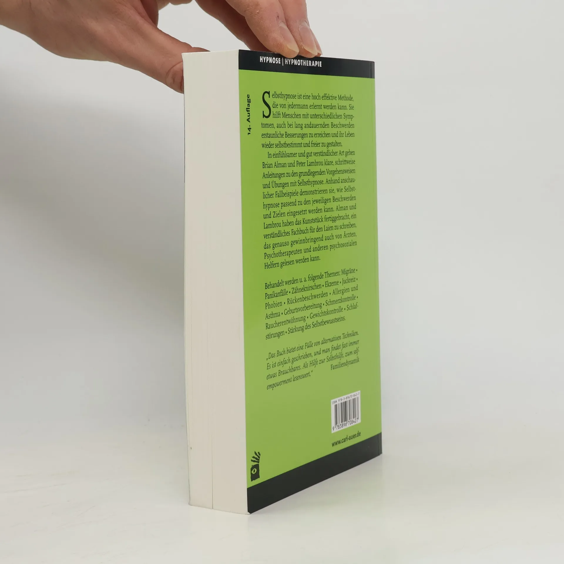 Selbsthypnose ist eine hocheffektive Methode, die von jedermann erlernt werden kann. Sie hilft Menschen mit unterschiedlichen Symptomen, auch bei lang andauernden Beschwerden erstaunliche Besserungen zu erreichen und das Leben wieder selbstbestimmt und freier zu gestalten. Auf einfühlsame und gut verständliche Art geben Brian Alman und Peter Lambrou klare, schrittweise Anleitungen zu den grundlegenden Vorgehensweisen und Übungen mit Selbsthypnose. Anhand anschaulicher Fallbeispiele demonstrieren sie, wie Selbsthypnose passend zu den jeweiligen Beschwerden und Zielen eingesetzt werden kann. Alman und Lambrou haben das Kunststück fertiggebracht, ein verständliches Fachbuch für den Laien zu schreiben, das genauso gewinnbringend auch von Ärzten, Psychotherapeuten und anderen psychosozialen Helfern gelesen werden kann. Das Buch behandelt u. a. folgende Themen: Migräne • Panikanfälle • Zähneknirschen • Ekzeme • Juckreiz • Phobien • Rückenbeschwerden • Allergien und Asthma • Geburtsvorbereitung • Schmerzkontrolle • Raucherentwöhnung • Gewichtskontrolle • Schlafstörungen • Stärkung des Selbstbewusstseins.