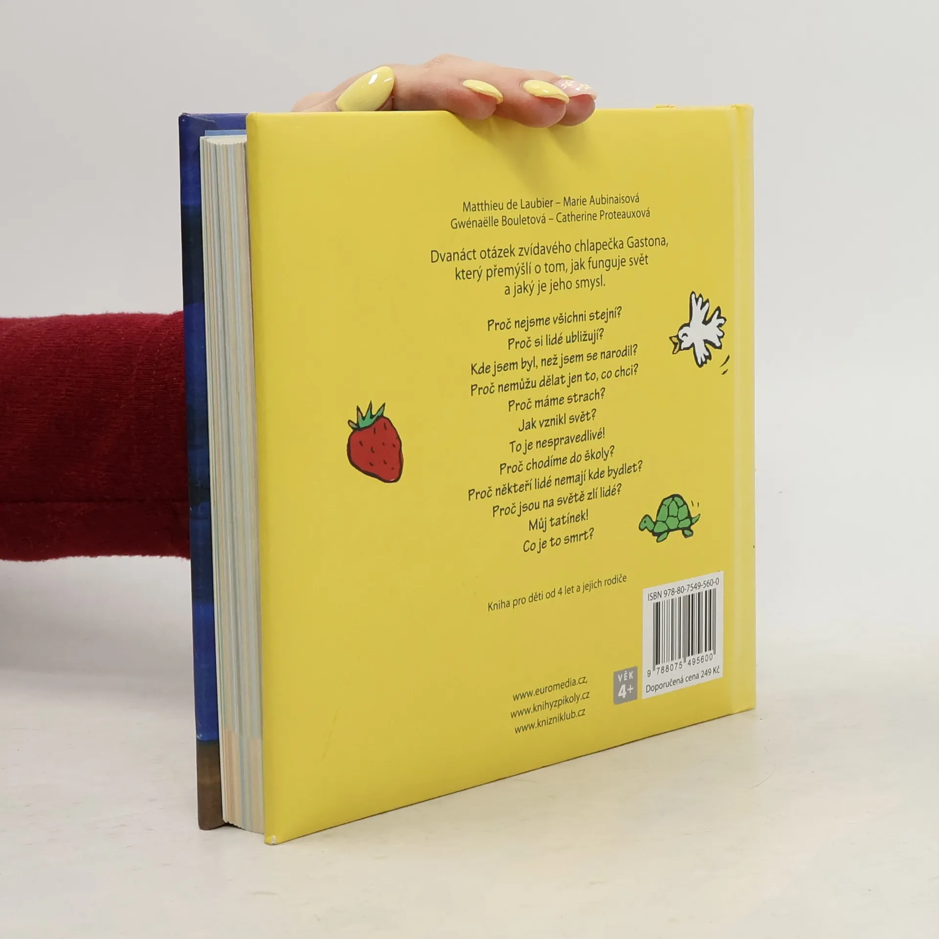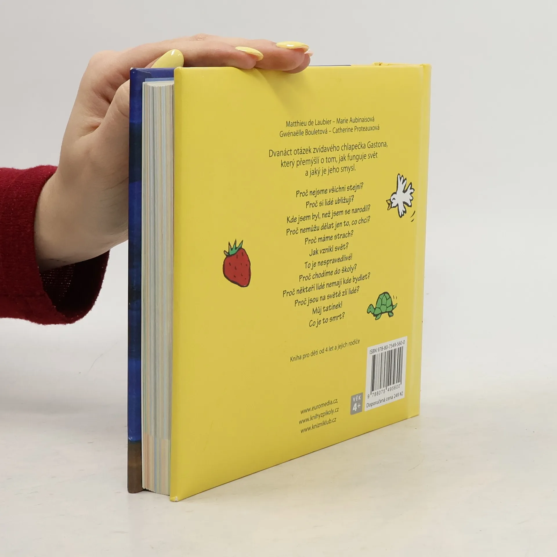 Půvabná knížka plná dynamických ilustrací představuje dvanáct velkých otázek lidské existence, které děti zajímají, když začínají poznávat svět kolem sebe. Gastonovo přemýšlení o okolním světě umožní dětem a jejich rodičům vést nad knížkou vlastní důvěrné rozhovory, a kapitolky pro rodiče v závěru usnadňují dospělým, aby v dialogu se svým dítětem nalezli slova, která uklidní, pomohou a přinesou pokrok ve vývoji.
