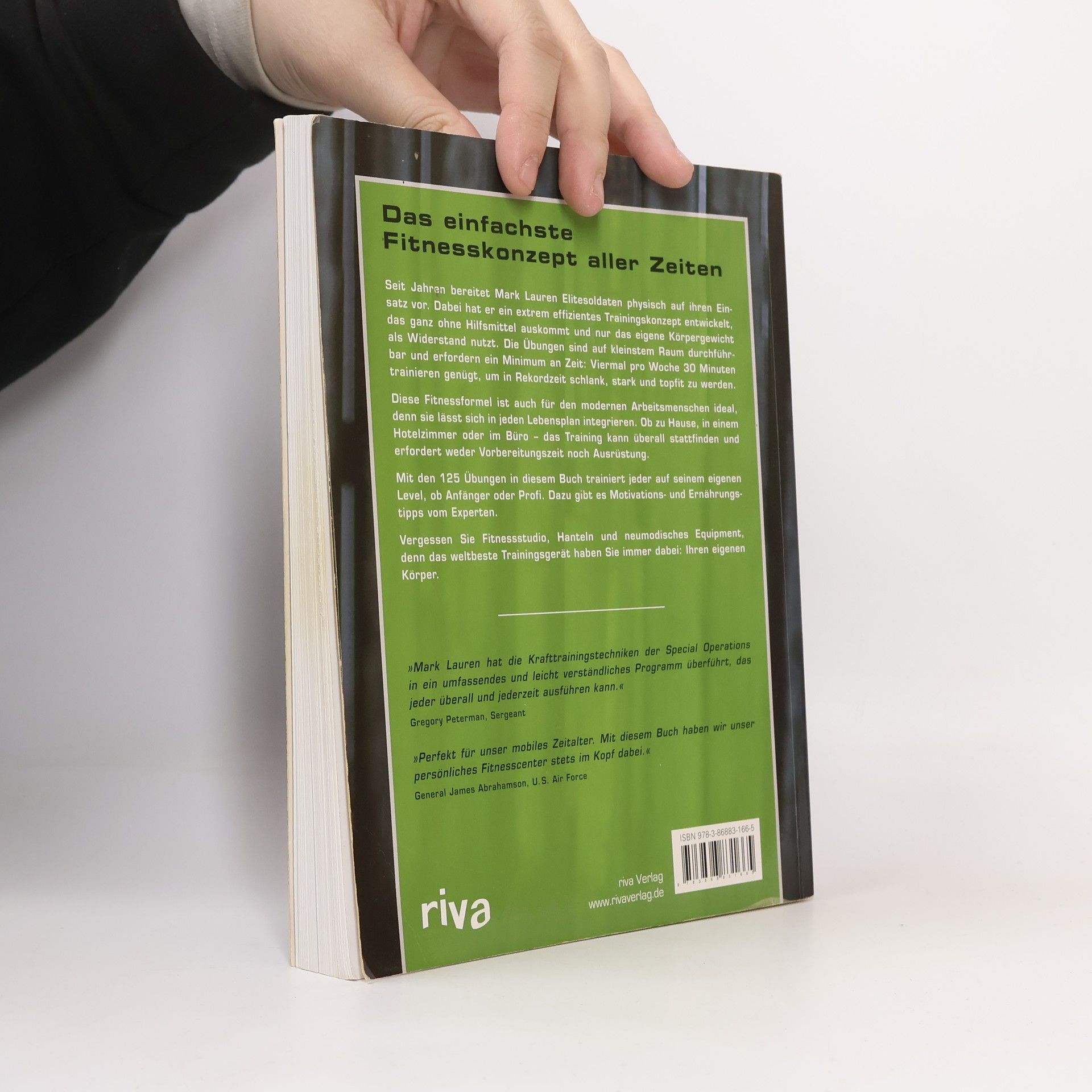 Seit Jahren bereitet Mark Lauren Elitesoldaten physisch auf ihren Einsatz bei Special Operations vor. Dabei hat er ein einfaches und extrem effizientes Trainingskonzept entwickelt, das ganz ohne Hilfsmittel auskommt und nur das eigene Körpergewicht als Widerstand nutzt. Die Übungen sind auch auf kleinstem Raum durchführbar und erfordern ein Minimum an Zeit: Viermal pro Woche 30 Minuten trainieren genügt, um in Rekordzeit schlank, stark und topfit zu werden.Diese Fitnessformel ist auch für den modernen Arbeitsmenschen ideal, denn sie lässt sich in jeden Lebensplan integrieren. Ob zu Hause, in einem Hotelzimmer oder im Büro - das Training kann überall stattfinden. Vorbereitungszeit ist nicht nötig, denn man braucht ja keine Ausrüstung und auch die Anfahrt zum Fitnesscenter entfällt. Mit den 125 Übungen in diesem Buch trainiert jeder auf seinem eigenen Level, ob Anfänger oder Profi. Dazu gibt es Motivations- und Ernährungstipps vom Experten.