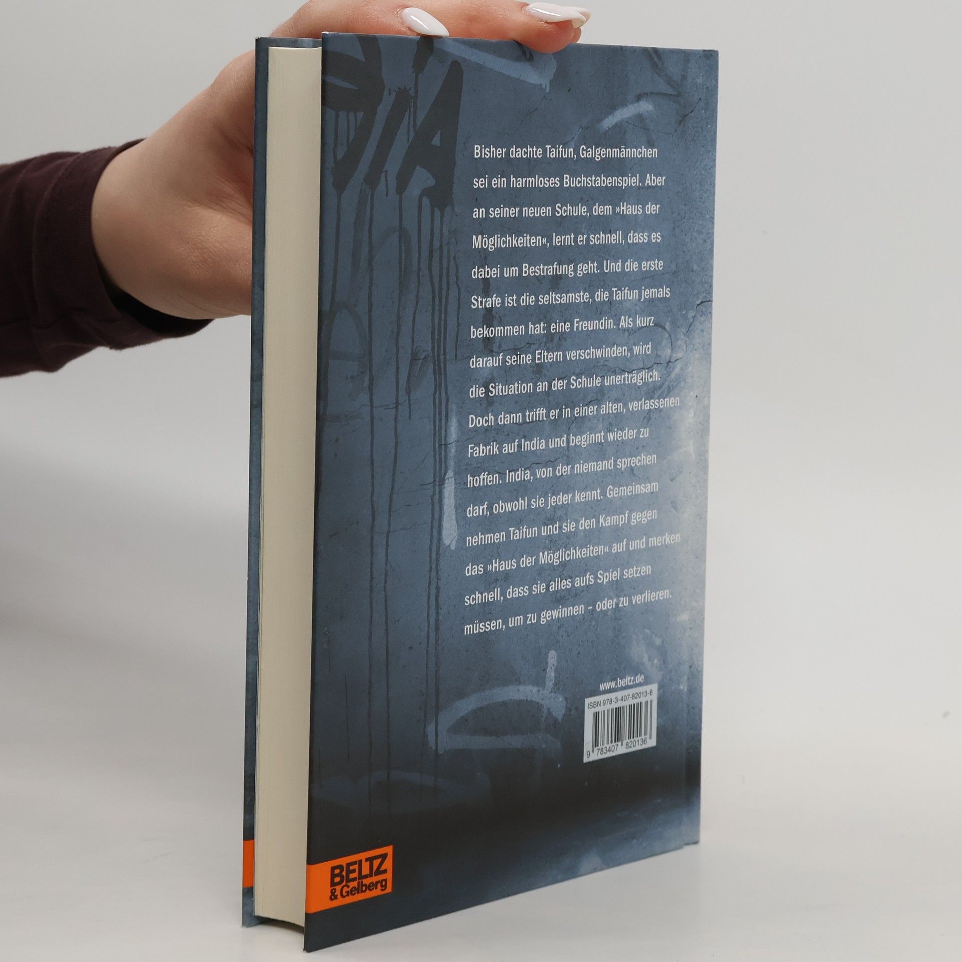 Bisher dachte Taifun, Galgenmännchen sei ein harmloses Buchstabenspiel. Doch an der Schule der Möglichkeiten lernt er, dass es dabei um Bestrafung geht. Und die erste Strafe ist die seltsamste, die Taifun jemals bekommen hat: eine Freundin. Taifun liebt sein Skateboard, seine Stadt, sein Leben - alles ganz normale Dinge. Doch hin und wieder springt er in einen Zug und lässt sich davontragen, irgendwohin. Seiner Stiefmutter Ira Frost sind diese Ausbrüche ein Dorn im Auge und so sorgt sie dafür, dass Taifun auf die Schule der Möglichkeiten kommt. Ein Ort, der den Schülern eher Möglichkeiten nimmt als sie ihnen zu bieten. Doch wieso wehrt sich kein Schüler gegen die Bestrafungen? Was verbirgt sich im geheimnisvollen Keller der Schule? Und was weiß Taifuns Stiefmutter? Erst als Taifun in einer verlassenen Fabrik auf India trifft, beginnt er wieder zu hoffen. India, von der niemand sprechen darf, obwohl sie jeder kennt. India, die an dem geheimnisvollen Ort lebt, wo sie Skateboard fährt und Graffiti sprüht. Gemeinsam nehmen Taifun und sie den Kampf gegen die Schule auf und merken schnell, dass sie alles aufs Spiel setzen müssen, um zu gewinnen - oder zu verlieren. Eine Geschichte aus dem Leben, realistisch und zugleich fantastisch. Mit scharfem Blick erzählt Taifun, wie es ist, Teil eines absolutistischen Schulsystems zu sein und sich innerhalb einer geschlossenen Gesellschaft aufzulehnen.