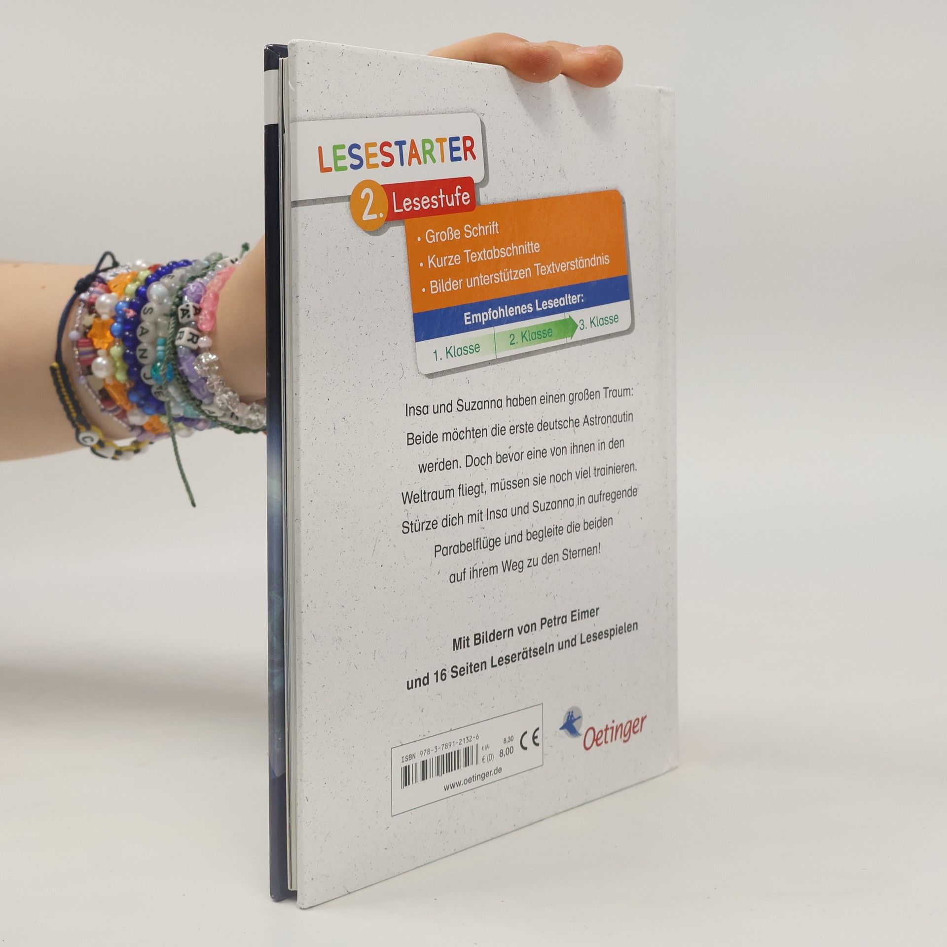 Flieg mit Insa und Suzanna zu den Sternen! Elf deutsche Männer waren bisher im Weltall. Jetzt ist endlich eine Frau an der Reihe! Dank der Initiative „Die Astronautin“ bereiten sich erstmals zwei deutsche Frauen auf eine Forschungsmission zur ISS vor: Dr. Insa Thiele-Eich und Dr. Suzanna Randall lassen die Kinder am größten Abenteuer ihres Lebens teilhaben, erzählen von ihrem spannenden Training und stürzen sich mit den Lesern in aufregende Parabelflüge. Als Vorbilder wecken sie dabei speziell bei Mädchen die Begeisterung für Naturwissenschaft und Technik. Und die Reise in den Weltraum geht weiter, wenn die Astronautinnen in Band 2 von ihrem Flug mit der ISS berichten. Lesenlernen wie eine Rakete mit den Lesestartern von Oetinger. Mit starken Charakteren und populären Themen werden Kinder im Alter von fünf bis zehn Jahren für das Lesen begeistert - dazu gibt es viele Bilder, tolle Spiele und Leserätsel.