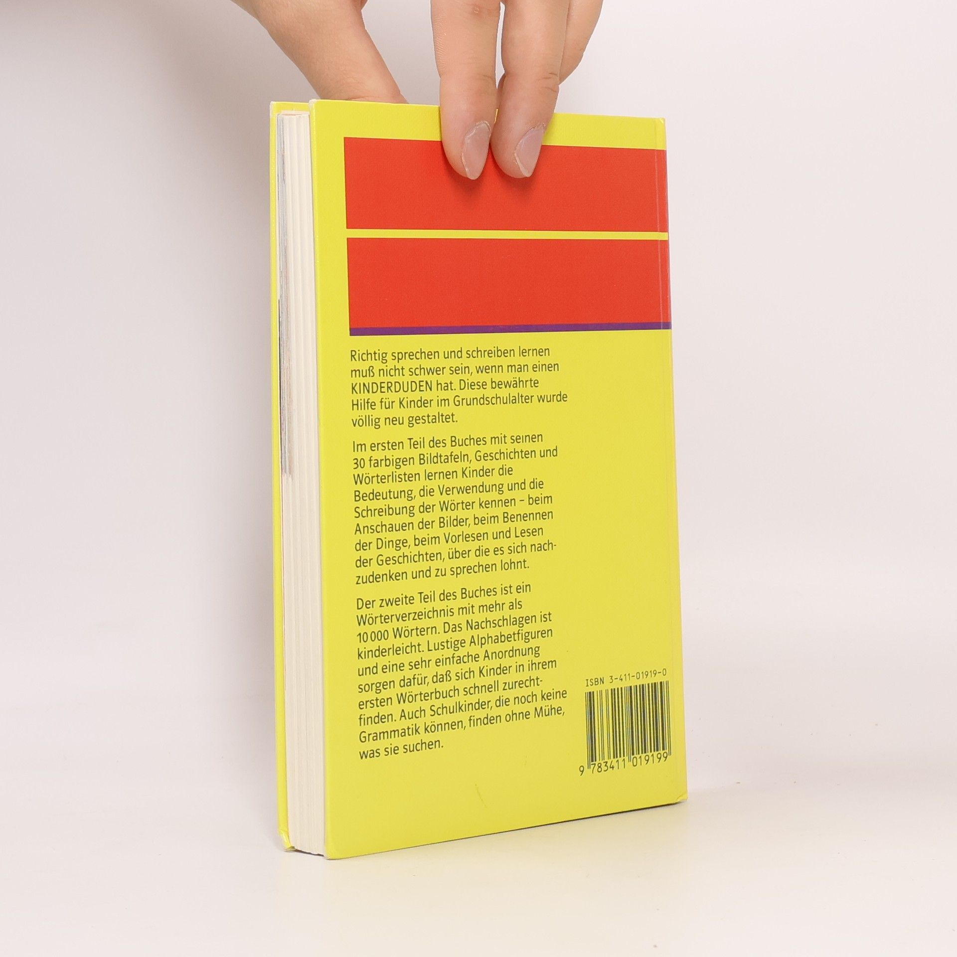 Richtig sprechen und schreiben lernen muß nicht schwer sein, wenn man einen KINDERDUDEN hat. Diese bewährte Hilfe für Kinder im Grundschulalter wurde völlig neu gestaltet.Im ersten Teil des Buches mit seinen 30 farbigen Bildtafeln, Geschichten und Wörterlisten lernen Kinder die Bedeutung, die Verwendung und die Schreibung der Wörter kennen - beim Anschauen der Bilder, beim Benennen der Dinge, beim Vorlesen und Lesen de'r Geschichten, über die es sich nachzudenken und zu sprechen lohnt.Der zweite Teil des Buches ist ein Wörterverzeichnis mit mehr als 10000 Wörtern. Das Nachschlagen ist kinderleicht. Lustige Alphabetfiguren und eine sehr einfache Anordnung sorgen dafür, daß sich Kinder in ihrem ersten Wörterbuch schnell zurechtfinden. Auch Schulkinder, die noch keine Grammatik können,finden ohne Mühe, was sie suchen.