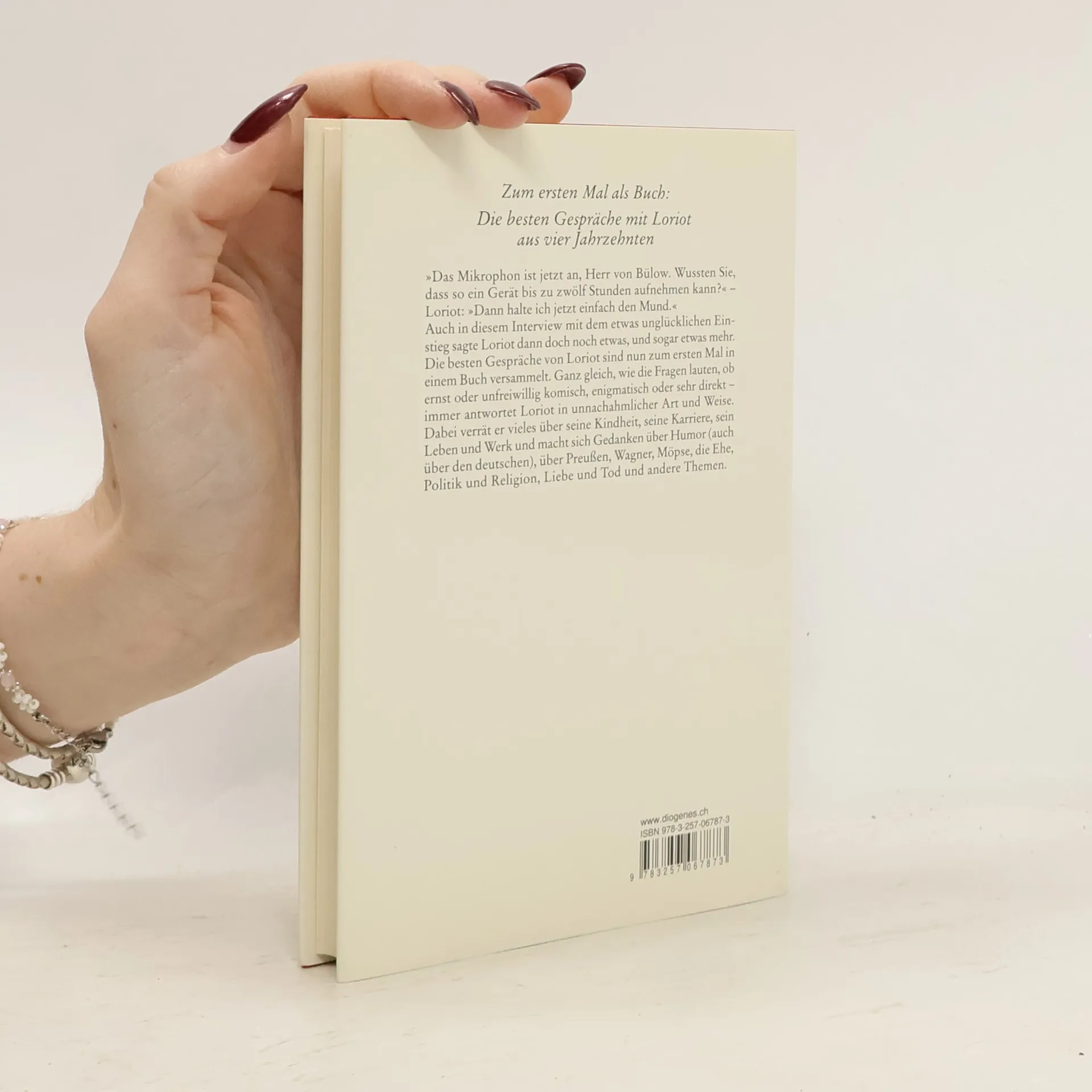 »Das Mikrophon ist jetzt an, Herr von Bülow. Wussten Sie, dass so ein Gerät bis zu zwölf Stunden aufnehmen kann?« Loriot: »Dann halte ich jetzt einfach den Mund.« Auch in diesem Interview mit dem etwas unglücklichen Einstieg sagte Loriot dann doch noch etwas, und sogar etwas mehr. Die besten Gespräche von Loriot sind nun zum ersten Mal in einem Buch versammelt. Ganz gleich, wie die Fragen lauten, ob ernst oder unfreiwillig komisch, enigmatisch oder klar immer antwortet Loriot in seiner unnachahmlichen Art und Weise. Dabei verrät er vieles über seine Kindheit, seine Karriere, sein Leben und Werk und macht sich Gedanken über Humor (auch über den deutschen), über Preußen, Wagner, Möpse, die Ehe, Politik und Religion, Liebe und Tod und andere gefragte Themen.