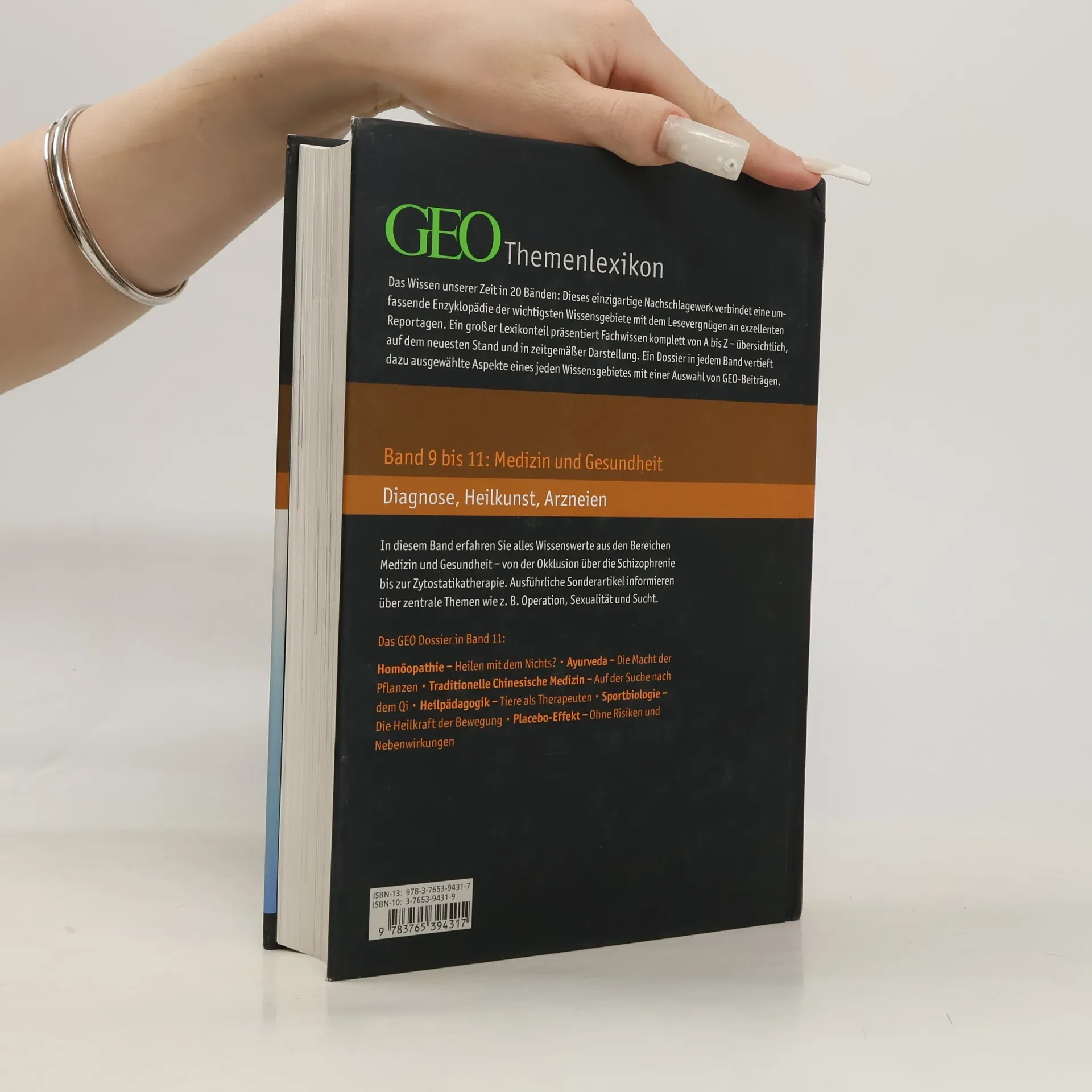 Das Wissen unserer Zeit in 20 Themenbänden: Dieses einzigartige und preisgünstige Nachschlagewerk ist eine Kooperation des Brockhaus-Verlages mit dem Reportagemagazin GEO und verbindet eine umfassende Enzyklopädie der wichtigsten Wissensgebiete mit dem Lesevergnügen an exzellenten Reportagen im GEO Dossier, das den alphabetischen Stichwortbestand eines jeden Bandes ergänzt. Die Bände 9 bis 11 beschäftigen sich mit dem Themenbereich »Medizin und Gesundheit«.