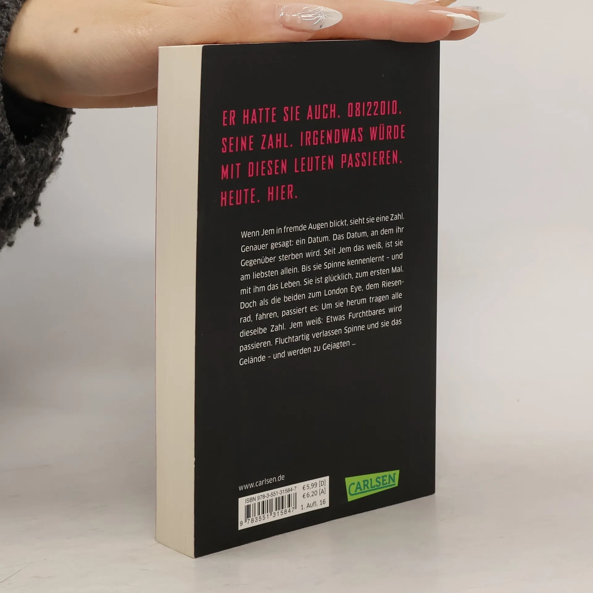 Wenn Jem in fremde Augen blickt, sieht sie eine Zahl. Genauer gesagt: ein Datum. Das Datum, an dem ihr Gegenüber sterben wird. Seit Jem das weiß, ist sie am liebsten allein. Bis sie Spinne kennenlernt – und mit ihm das Leben. Sie ist glücklich, zum ersten Mal. Doch als die beiden zum Riesenrad, dem London Eye fahren, passiert es: um sie herum tragen alle dieselbe Zahl. Jem weiß: Etwas Furchtbares wird passieren. Heute. Hier. Fluchtartig verlassen Spinne und sie das Gelände – und werden zu Gejagten …