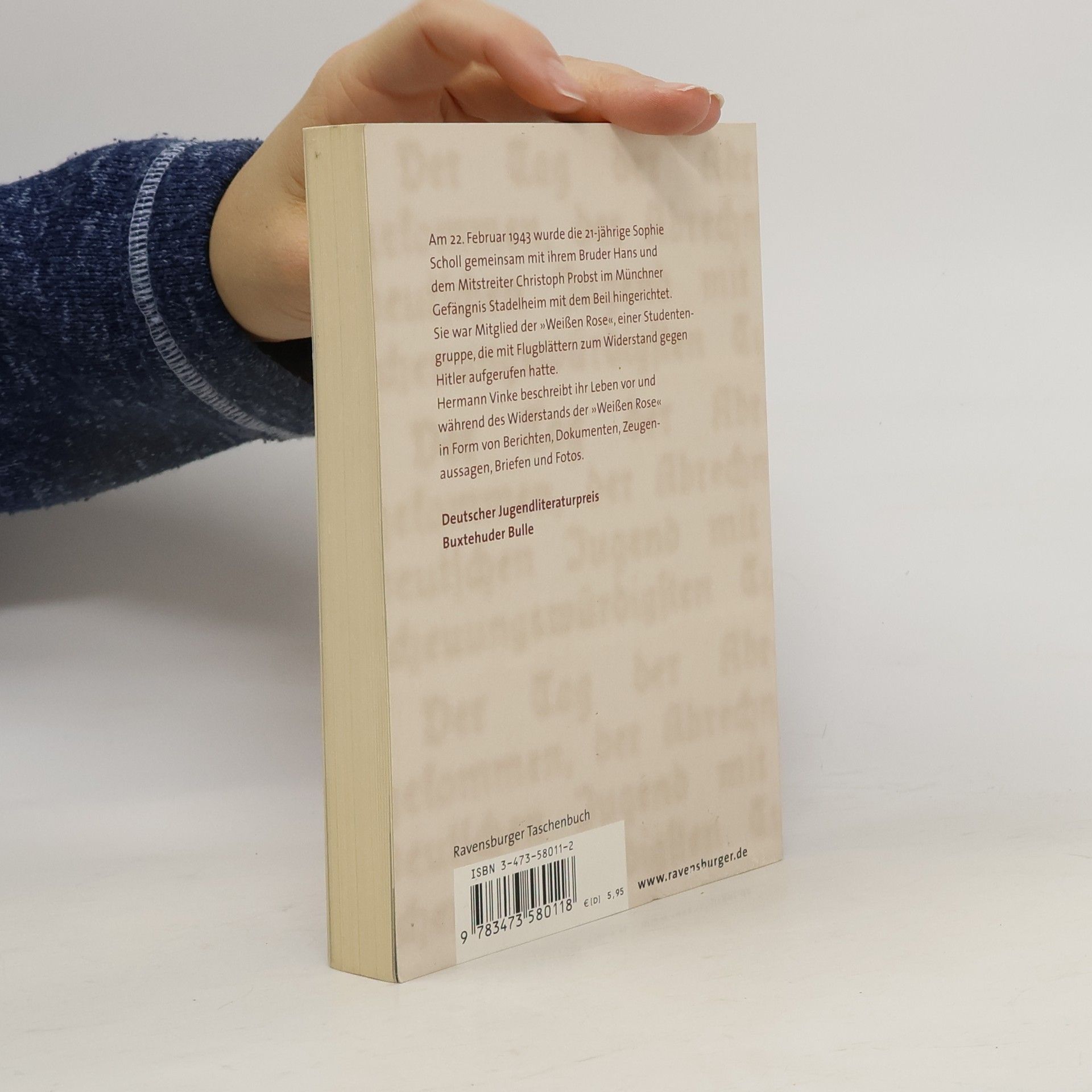 Am 22. Februar 1943 wurde die einundzwanzigjährige Sophie Scholl gemeinsam mit ihrem Bruder Hans und dem Mitstreiter Christoph Probst im Münchner Gefängnis Stadelheim hingerichtet. Sie war Mitglied der „Weißen Rose“, einer Studentengruppe, die mit Flugblättern zum Widerstand gegen Hitler aufgerufen hatte. Hermann Vinke beschreibt ihr Leben vor und während des Widerstands der „Weißen Rose“ in Form von Berichten, Dokumenten, Zeugenaussagen, Briefen und Fotos. Ein seltenes und erschütterndes Dokument über ein mutiges Mädchen in einer unheilvollen Zeit: Sophie Scholl interessierte sich kaum für politische Fragen, wurde aber aufgrund ihres nazikritischen Elternhauses trotzdem zur Widerstandskämpferin. In einer menschenfeindlichen Gesellschaft kämpfte sie mit großem Mut und Einsatz für ihre eigenen Ansichten und Ziele. Dadurch wurde sie zu einem unvergessenen Vorbild, auch für Jugendliche der heutigen Zeit. Hermann Vinke beschreibt das Leben dieser außergewöhnlichen jungen Frau, indem er ihre eigenen Aufzeichnungen mit Erinnerungen und Auszügen aus Briefen sowie dem historischen Hintergrund des Nationalsozialismus kombiniert.