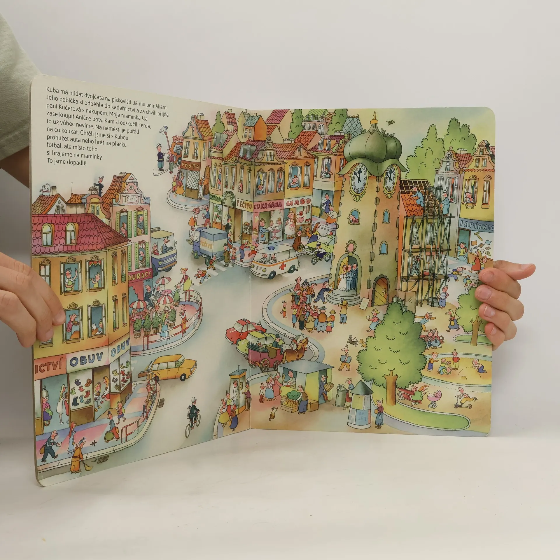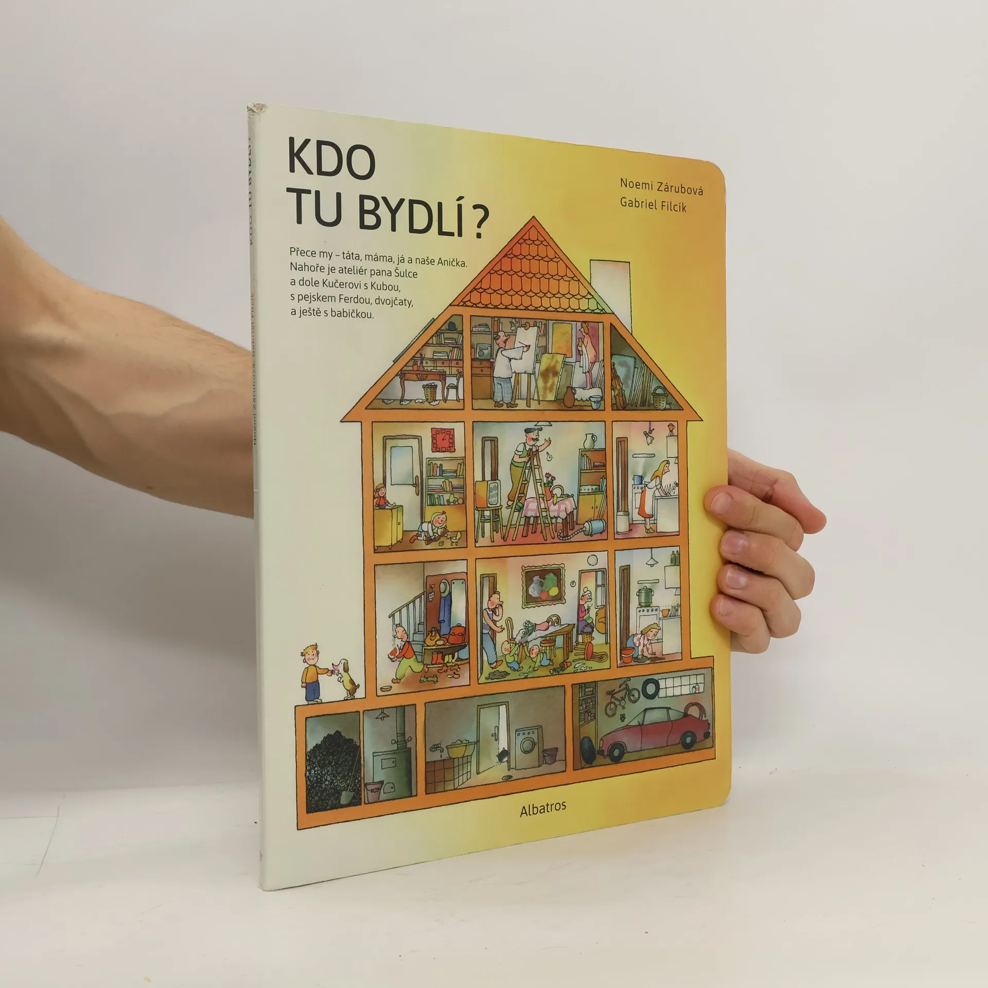 Dům je plný lidí a kolem něj je město plné zajímavých míst... Co všechno se tam během dne i v noci děje? To děti zjistí spolu s hlavním hrdinou příběhu, jeho malou sestřičkou a kamarádem Kubou: podívají se do školky, na pískoviště i do nemocnice. A dokonce pojedou vlakem k babičce na venkov a tam je teprve co k probádání! Bohatě ilustrované dvoustrany vybízejí ke zkoumání a objevování veselých detailů – s tímto leporelem je zkrátka legrace až na půdu.