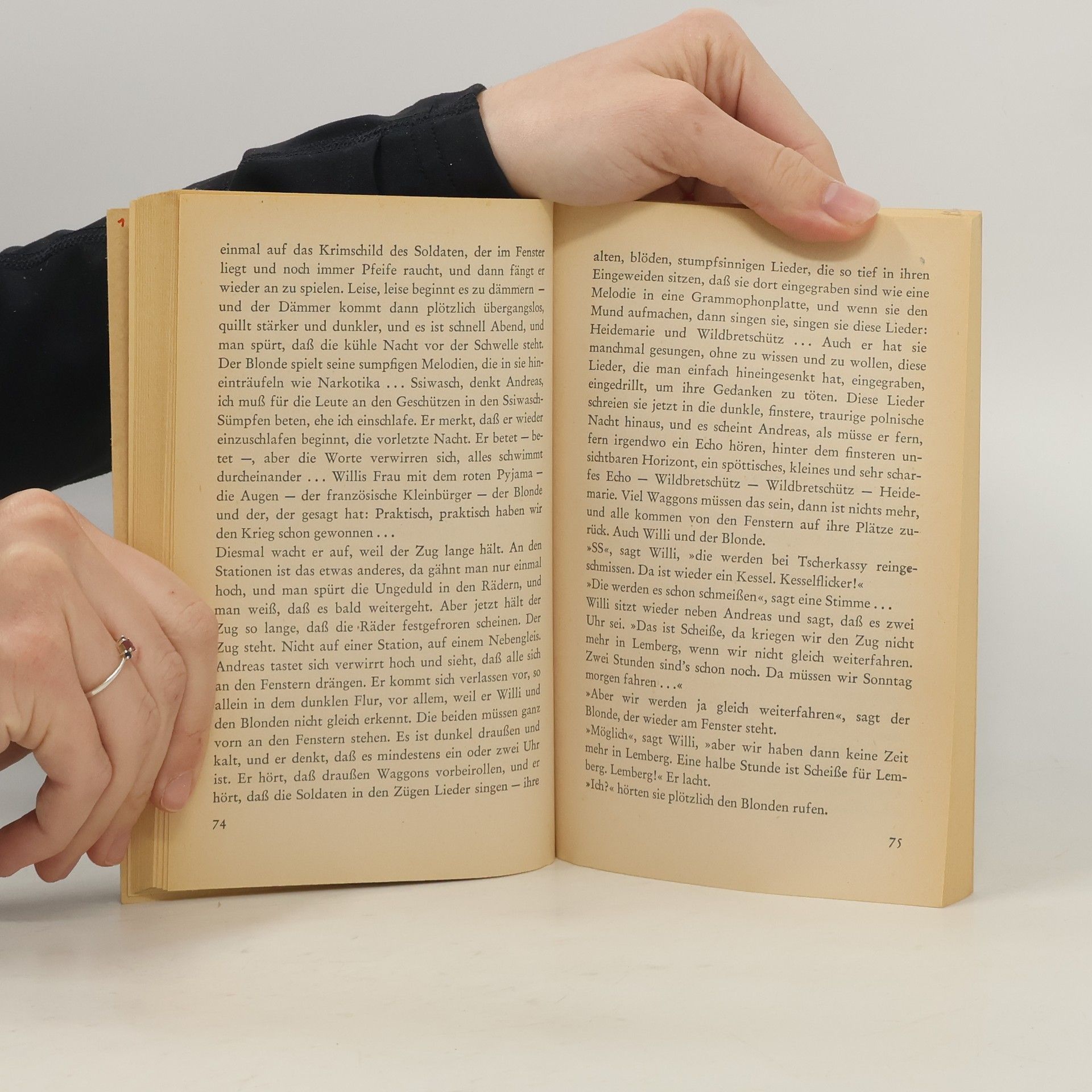 »Ich will nicht sterben, aber das Schreckliche ist, daß ich sterben werde ... bald!« Mit dieser Gewißheit steigt der junge Soldat auf dem Bahnhof einer Stadt im Ruhrgebiet in den Fronturlauberzug, der ihn an die Ostfront zurückbringen soll. Es wird eine trostlose Fahrt. Männer, die der Zufall zusammengewürfelt hat, spielen Skat, teilen miteinander Brot und Wurst und versuchen ihre Angst mit Schnaps zu betäuben. Andreas erinnert sich an seinen Freund, an eine Frau, in deren Augen er nur für Bruchteile einer Sekunde blicken konnte, er denkt an seine früheren Verwundungen, und er haßt alle, die den Krieg als eine Selbstverständlichkeit empfinden. In Lemberg hält der Zug. Hier begegnet Andreas einer Spionin, die als Prostituierte Nachrichten für den polnischen Widerstand sammelt ...