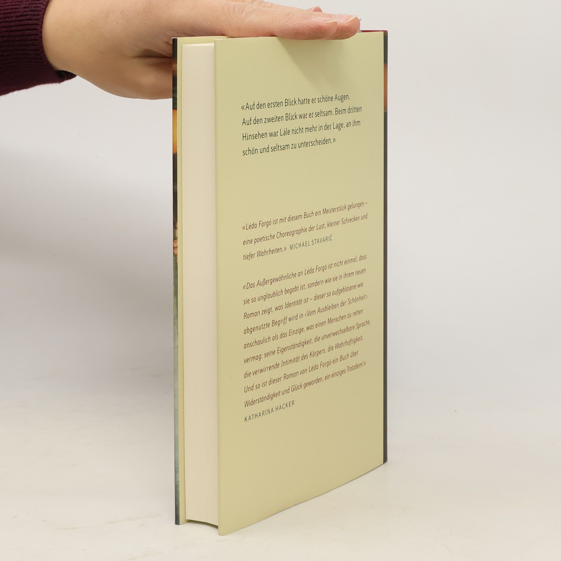 «Auf den ersten Blick hatte er schöne Augen. Auf den zweiten Blick war er seltsam. Beim dritten Hinsehen war Lále nicht mehr in der Lage, an ihm schön und seltsam zu unterscheiden.» «Léda Forgó ist mit diesem Buch ein Meisterstück gelungen — eine poetische Choreographie der Lust, kleiner Schrecken und tiefer Wahrheiten.» Michael Stavaric «Das Außergewöhnliche an Léda Forgó ist nicht einmal, dass sie so unglaublich begabt ist, sondern wie sie in ihrem neuen Roman zeigt, was Identität ist — dieser so aufgeblasene wie abgenutzte Begriff wird in ‹Vom Ausbleiben der Schönheit› anschaulich als das Einzige, was einen Menschen zu retten vermag: seine Eigenständigkeit, die unverwechselbare Sprache, die verwirrende Intimität des Körpers, die Wahrhaftigkeit. Und so ist dieser Roman von Léda Forgó ein Buch über Widerständigkeit und Glück geworden, ein einziges Trotzdem!» Katharina Hacker