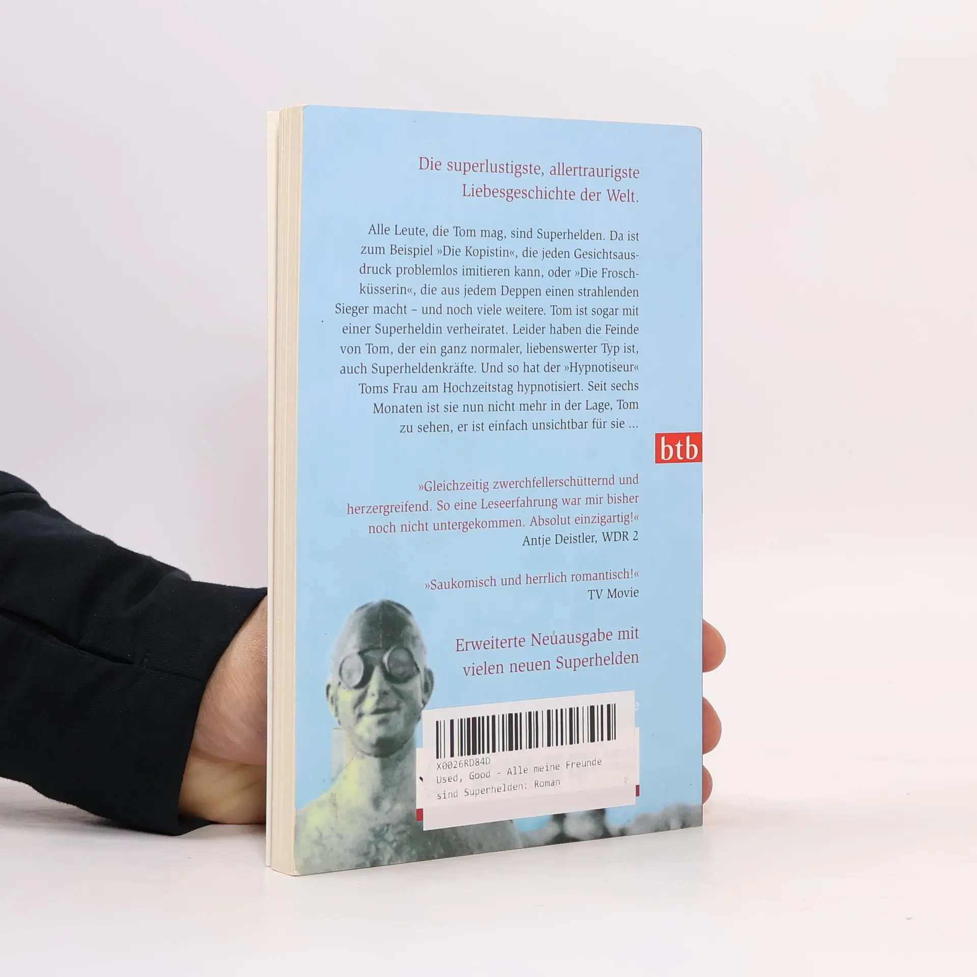 Die superlustigste und allertraurigste Liebesgeschichte der Welt Alle Leute, die Tom mag, sind Superhelden. Da ist zum Beispiel „Die Kopistin“, die jeden Gesichtsausdruck problemlos imitieren kann, oder „Die Froschküsserin“, die aus jedem Deppen einen strahlenden Sieger macht – und noch 40 weitere. Tom ist sogar mit einer Superheldin verheiratet. Leider haben die Feinde von Tom, der ein ganz normaler, liebenswerter Typ ist, auch Superheldenkräfte. Und so hat der Hypnotiseur Toms Frau am Hochzeitstag hypnotisiert. Seit sechs Monaten ist sie nun nicht mehr in der Lage, Tom zu sehen, er ist einfach unsichtbar für sie ...