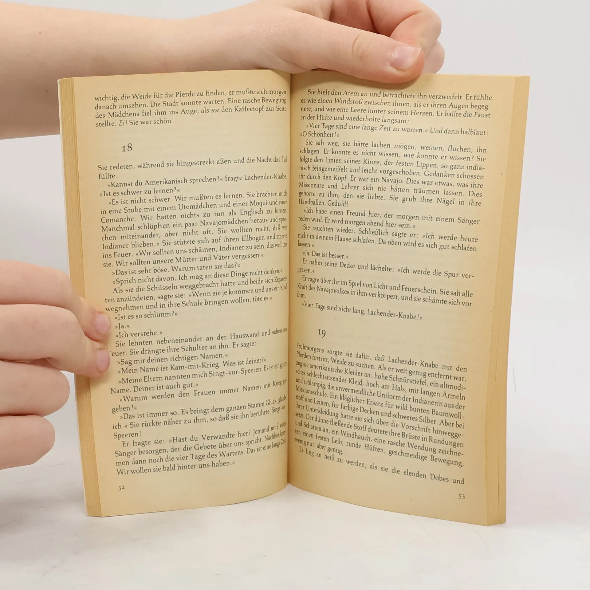 Eine der ehrlichsten und interessantesten Indianergeschichten von zeitloser Intensität. Der Navajo-Indianer Lachender-Knabe verliebt sich in schlankes-Mädchen. Sie gehört demselben Stamm an wie er, aber ihre Vergangenheit ist ihm fremd. Sie hat durch das Zusammenleben mit weißen Amerikanern die Bindung zu ihrem Volk verloren. Ihr gemeinsames Haus, in dem sie webt und er Silber schmiedet, wird ein glückliches Haus. Wenn sie reich genug sind, wollen sie zu seinem Volk in den Norden ziehen. - Der Roman, der 1929 in den USA erschien, ist auch heute noch eine der ehrlichsten und interessantesten Indianergeschichten von zeitloser Intensität.