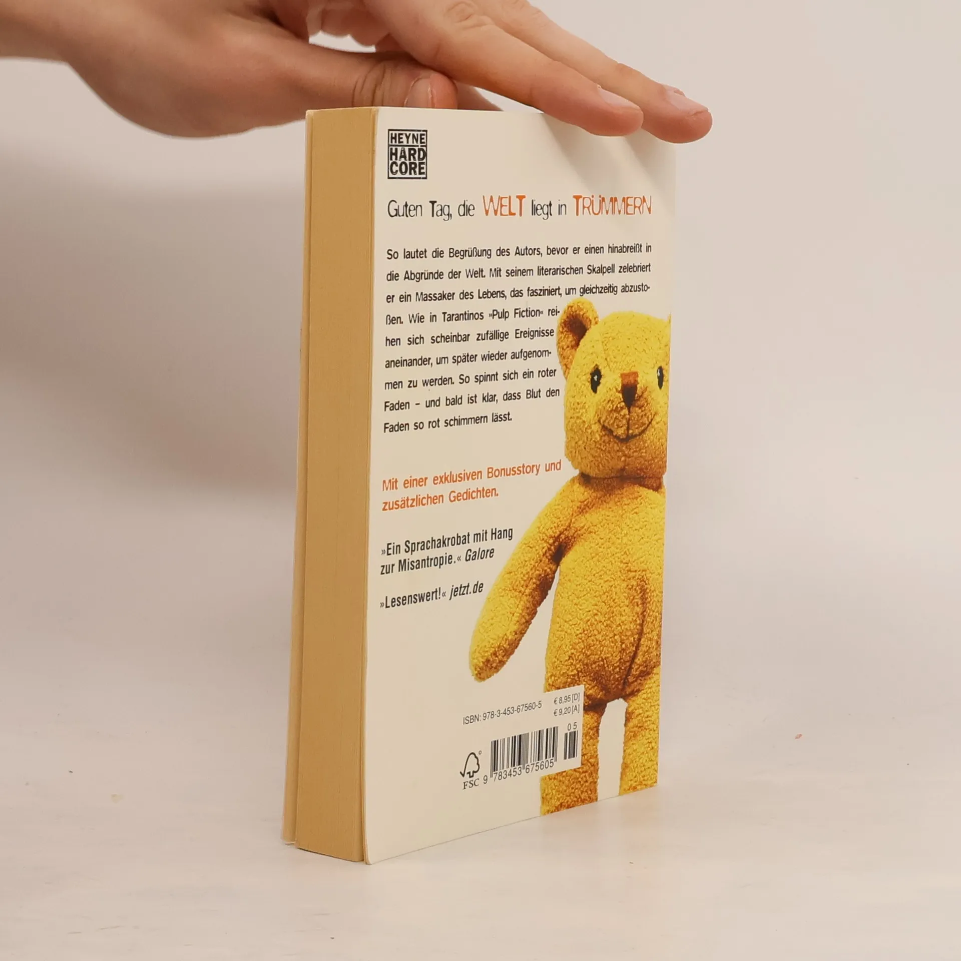 „Guten Tag, die Welt liegt in Trümmern.“ So lautet die Begrüßung des Autors, bevor er einen hinabreißt in die Abgründe der Welt. Mit seinem literarischen Skalpell zelebriert er ein Massaker des Lebens, das fasziniert, um gleichzeitig abzustoßen. Wie in Tarantinos „Pulp Fiction“ reihen sich scheinbar zufällige Ereignisse aneinander, um später wieder aufgenommen zu werden. So spinnt sich ein roter Faden – und bald ist klar, dass Blut den Faden so rot schimmern lässt. Mit einer exklusiven Zusatzstory