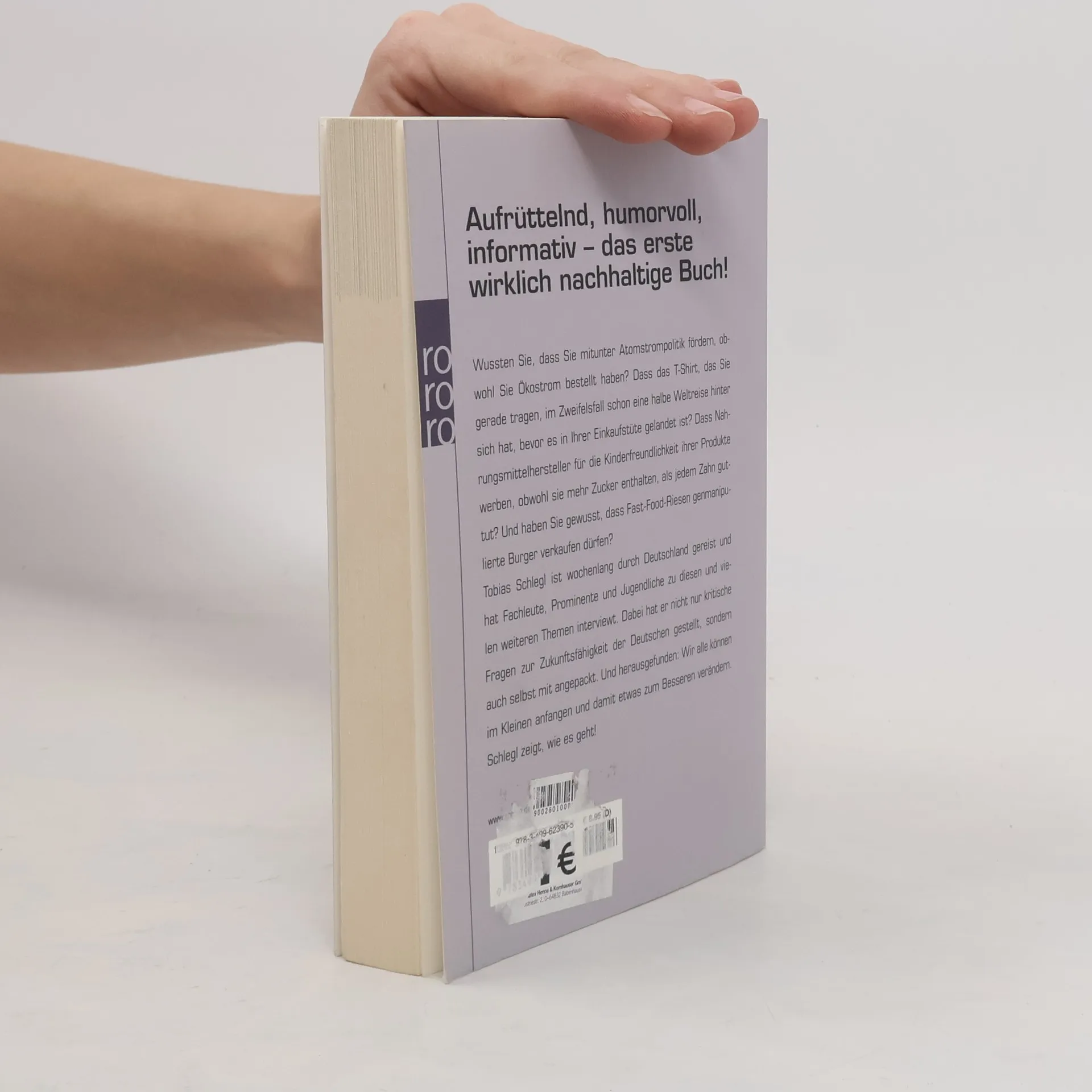 Aufrüttelnd, humorvoll, informativ – das erste wirklich nachhaltige Buch! Wussten Sie, dass Sie mitunter Atomstrompolitik fördern, obwohl Sie Ökostrom bestellt haben? Dass das T-Shirt, das Sie gerade tragen, im Zweifelsfall schon eine halbe Weltreise hinter sich hat, bevor es in ihrer Einkaufstüte gelandet ist? Dass Nahrungsmittelhersteller für die Kinderfreundlichkeit ihrer Produkte werben, obwohl sie mehr Zucker enthalten, als jedem Zahn guttut? Und haben Sie gewusst, dass Fast-Food-Riesen genmanipulierte Burger verkaufen dürfen? Tobias Schlegl ist wochenlang durch Deutschland gereist und hat Fachleute, Prominente und Jugendliche zu diesen und vielen weiteren Themen interviewt. Dabei hat er nicht nur kritische Fragen zur Zukunftsfähigkeit der Deutschen gestellt, sondern auch selbst mit angepackt. Und herausgefunden: Wir alle können im Kleinen anfangen und damit etwas zum Besseren verändern. Schlegl zeigt, wie es geht!