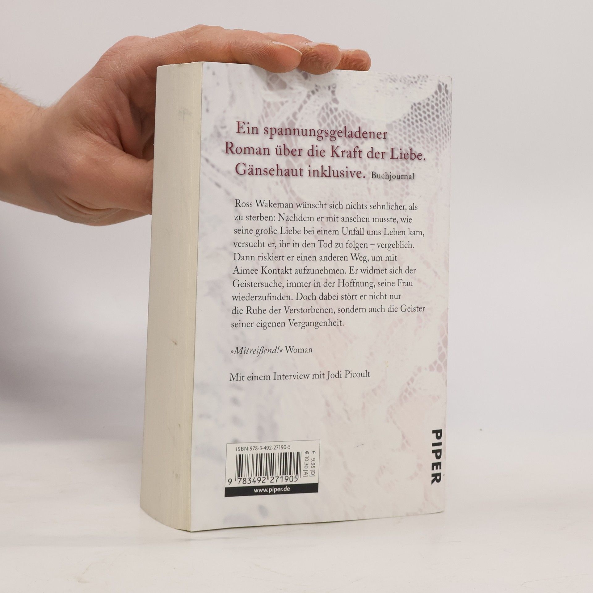 Ross Wakeman wünscht sich nichts sehnlicher, als zu sterben: Nachdem er mit ansehen musste, wie seine große Liebe bei einem Unfall ums Leben kam, versucht er, ihr in den Tod zu folgen – vergeblich. Dann riskiert er einen anderen Weg, um mit Aimee Kontakt aufzunehmen: Er widmet sich der Geistersuche, immer in der Hoffnung, seine Frau wiederzufinden. Doch dabei stört er nicht nur die Ruhe der Verstorbenen, sondern auch die Geister seiner eigenen Vergangenheit. – Mit einem Interview mit Jodi Picoult.