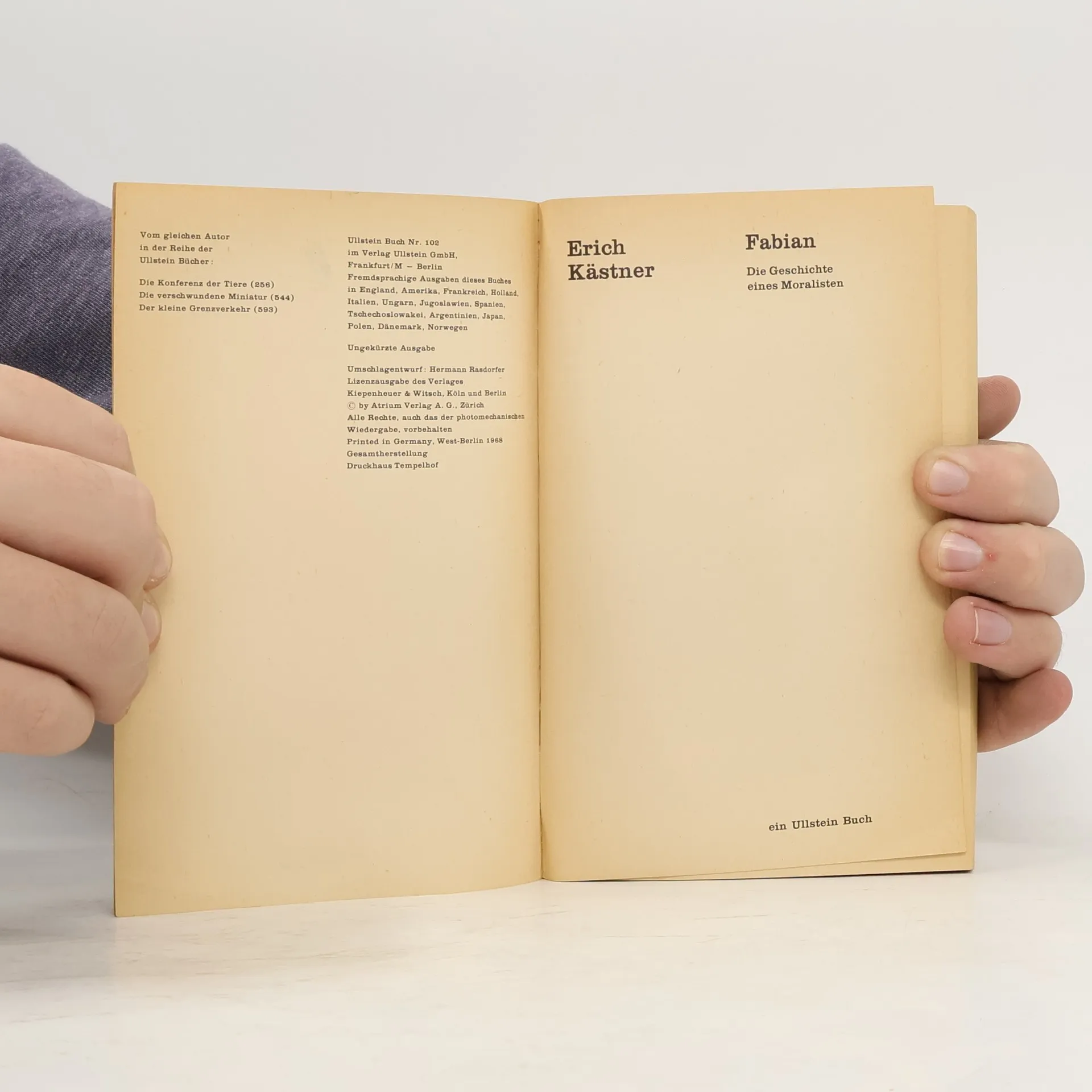 Bissig und schonungslosEine brillante und provokante Großstadtsatire im Berlin der frühen 30er Jahre. »Satirischer Roman von Erich Kästner, erschienen 1931. - Das Werk gilt als eine der brillantesten Satiren auf deutsche, insbesondere Berliner Zustände am Ende der zwanziger Jahre und während der großen Wirtschaftskrise um 1930. Titelheld ist der zweiunddreißigjährige Germanist Dr. Jakob Fabian, bisher Adressenschreiber, nun Reklametexter für eine Zigarettenfirma, ein »zarter Ironiker«, der »auf den Sieg der Anständigkeit wartet«, nicht gerade lebenstüchtig ist und von den Menschen immer wieder übervorteilt wird.«