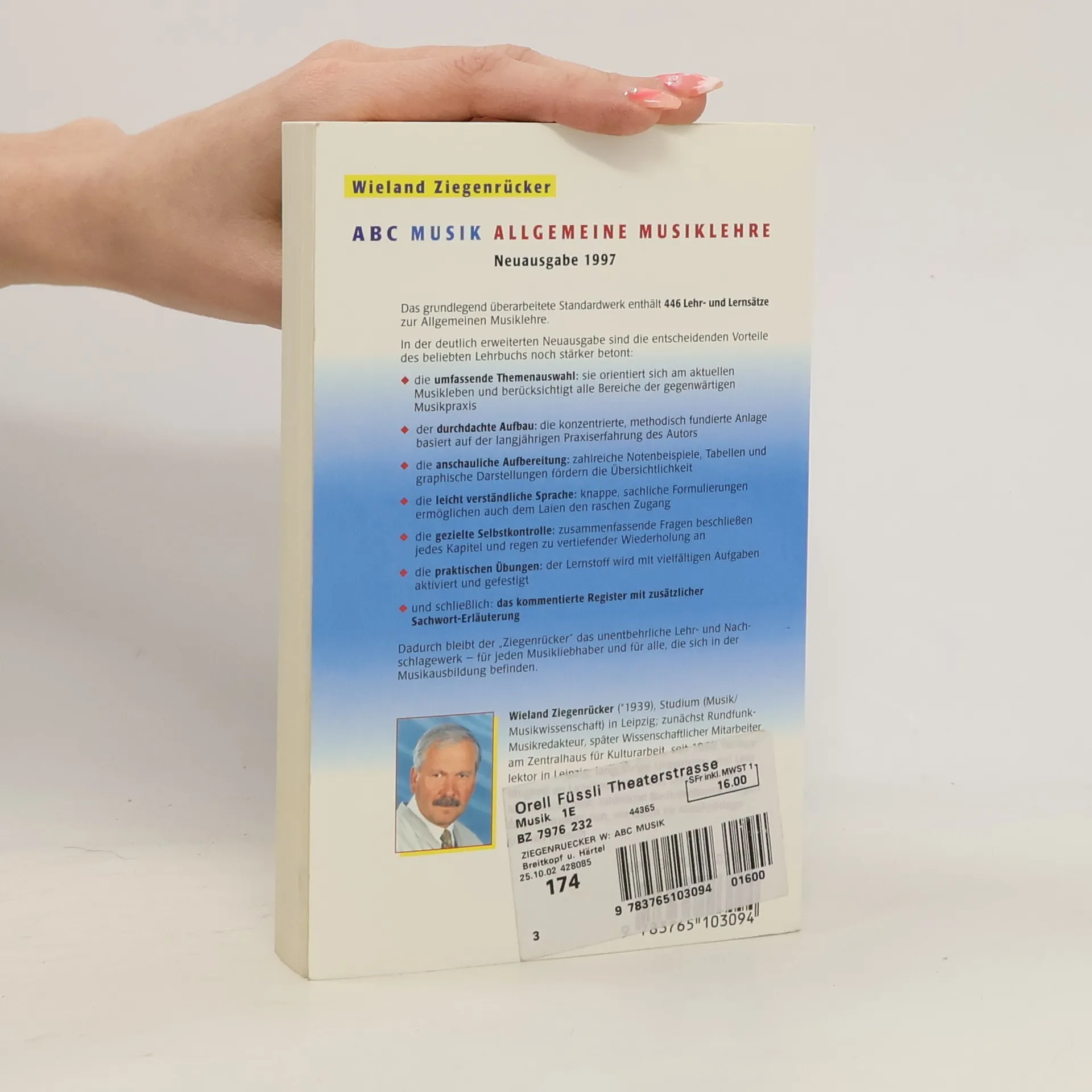 Unzählige Schüler(innen) und Studierende haben nach dem „ABC Musik“ die „Allgemeine Musiklehre“ buchstabieren gelernt. Nach fünf überaus erfolgreichen Auflagen der 1997 erstmals erschienenen Ausgabe hat Wieland Ziegenrücker sein Grundlagenbuch gründlich durchgesehen, aktualisiert und leicht erweitert. Die grundlegenden Qualitäten von „ABC Musik“ – umfassende Themenauswahl, durchdachter Aufbau, anschauliche Aufbereitung, leicht verständliche Sprache, praktische Übungen zur Lernkontrolle, Register mit Sachwort-Erläuterung – werden in der Neuausgabe noch stärker betont als zuvor.