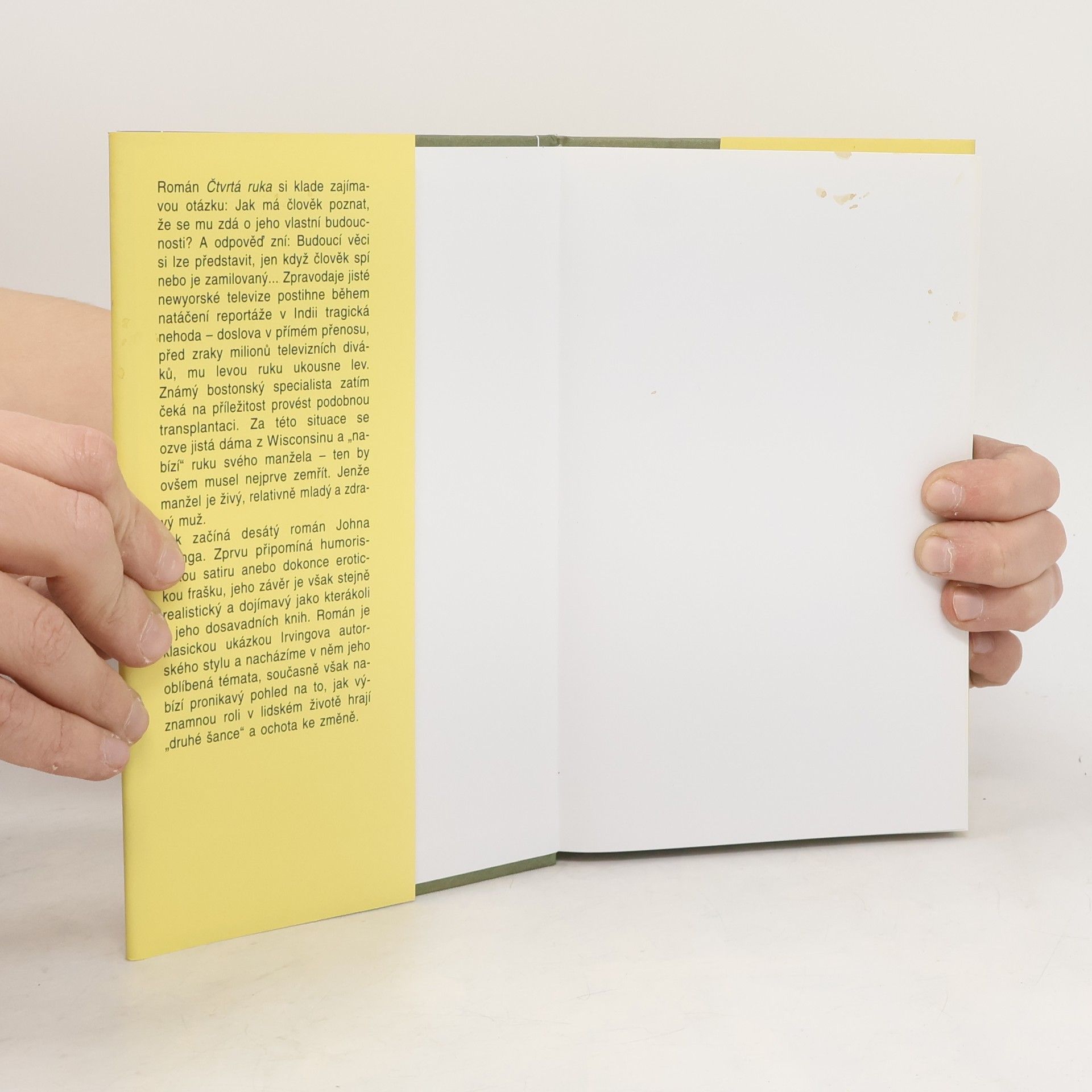 Román Čtvrtá ruka si klade zajímavou otázku: Jak má člověk poznat, že se mu zdá o jeho vlastní budoucnosti? A odpověď zní: Budoucí věci si lze představit, jen když člověk spí nebo je zamilovaný... Zpravodaje jisté newyorské televize postihne během natáčení reportáže v Indii tragická nehoda - doslova v přímém přenosu, před zraky milionů televizních diváků, mu levou ruku ukousne lev. Známý bostonský specialista zatím čeká na příležitost provést podobnou transplantaci. Za této situace se ozve jistá dáma z Wisconsinu a "nabízí" ruku svého manžela - ten by ovšem musel nejprve zemřít. Jenže manžel je živý, relativně mladý a zdravý muž. Tak začíná desátý román Johna Irvinga. Zprvu připomíná humoristickou satiru anebo dokonce erotickou frašku, jeho závěr je však stejně realistický a dojímavý jako kterákoli z jeho dosavadních knih. Román je klasickou ukázkou Irvingova autorského stylu a nacházíme v něm jeho oblíbená témata, současně však nabízí pronikavý pohled na to, jak významnou roli v lidském životě hrají "druhé šance" a ochota ke změně.... celý text
