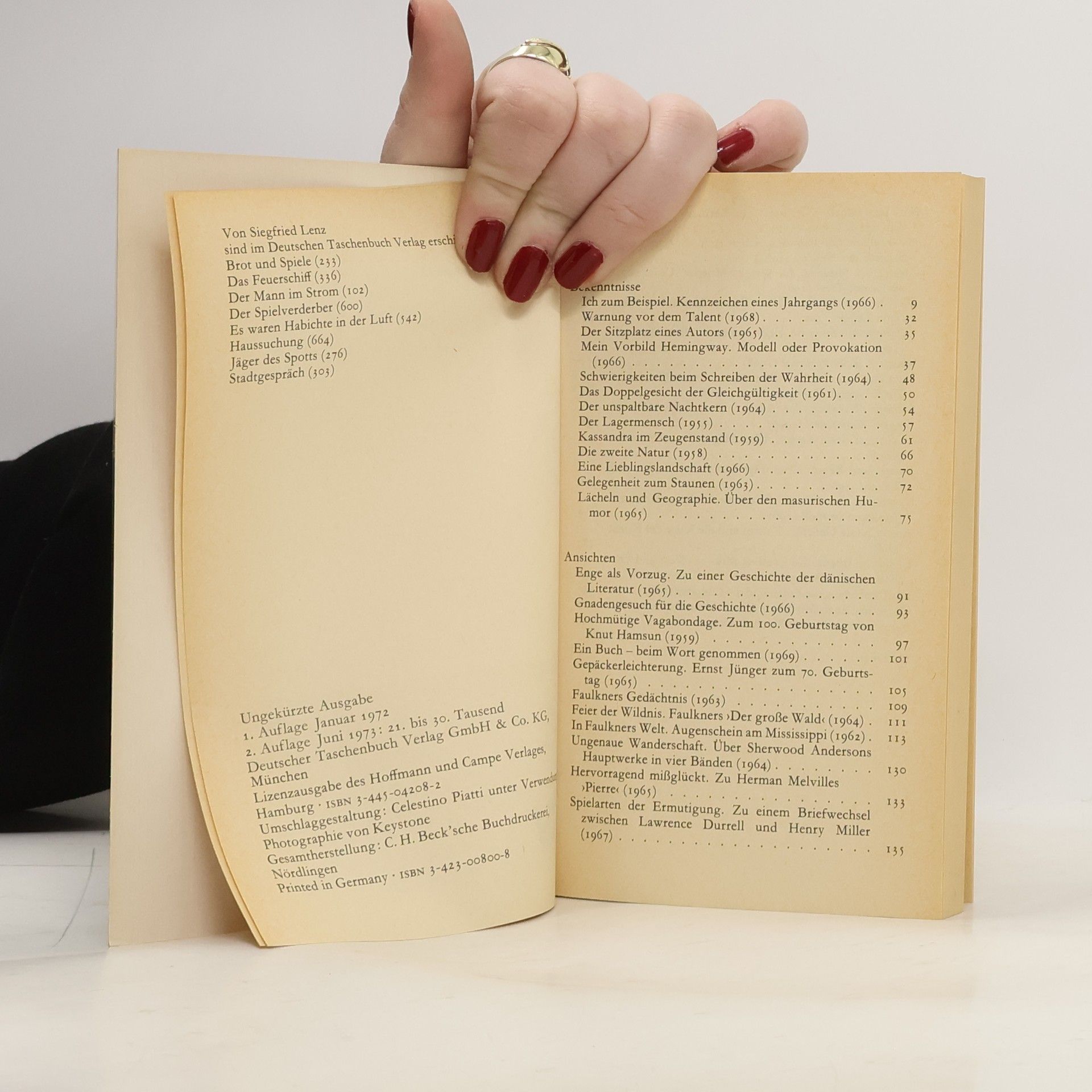 Schreiben als Selbstbefragung ist ein zentrales Thema in den Überlegungen von Siegfried Lenz zu Schriftstellern und deren Werken. Hinter seinen Urteilen steht stets eine persönliche Beziehung, die seine eigene schöpferische Existenz reflektiert. Lenz drängt dem Leser keine vorgefassten Meinungen auf, sondern präsentiert persönliche Ansichten aus seiner Perspektive. Er skizziert Hemingway und Faulkner als Vorbilder, bezieht Stellung zu Hamsun und Ernst Jünger, und versammelt Bölls Romangestalten in einem fiktiven Dorf. Auch Tolstoj, Nabokov, Andre Malraux und Carson McCullers finden in seinen Betrachtungen Beachtung, da deren Werke ihn ansprechen und herausfordern. Seine Ansichten zur zeitgenössischen Literatur sind oft von persönlichen Bekenntnissen zur eigenen Herkunft, Landschaften und seiner Arbeit begleitet. Die Inhalte umfassen Themen wie die Schwierigkeiten beim Schreiben der Wahrheit, das Doppelgesicht der Gleichgültigkeit und die Bedeutung von Landschaften. Zudem reflektiert er über die dänische Literatur, feiert Faulkners Werk und beleuchtet die Schriften von Autoren wie Melville und Anderson. Lenz' Texte sind eine Mischung aus persönlicher Reflexion und literarischer Analyse, die den Leser zum Nachdenken anregen.
