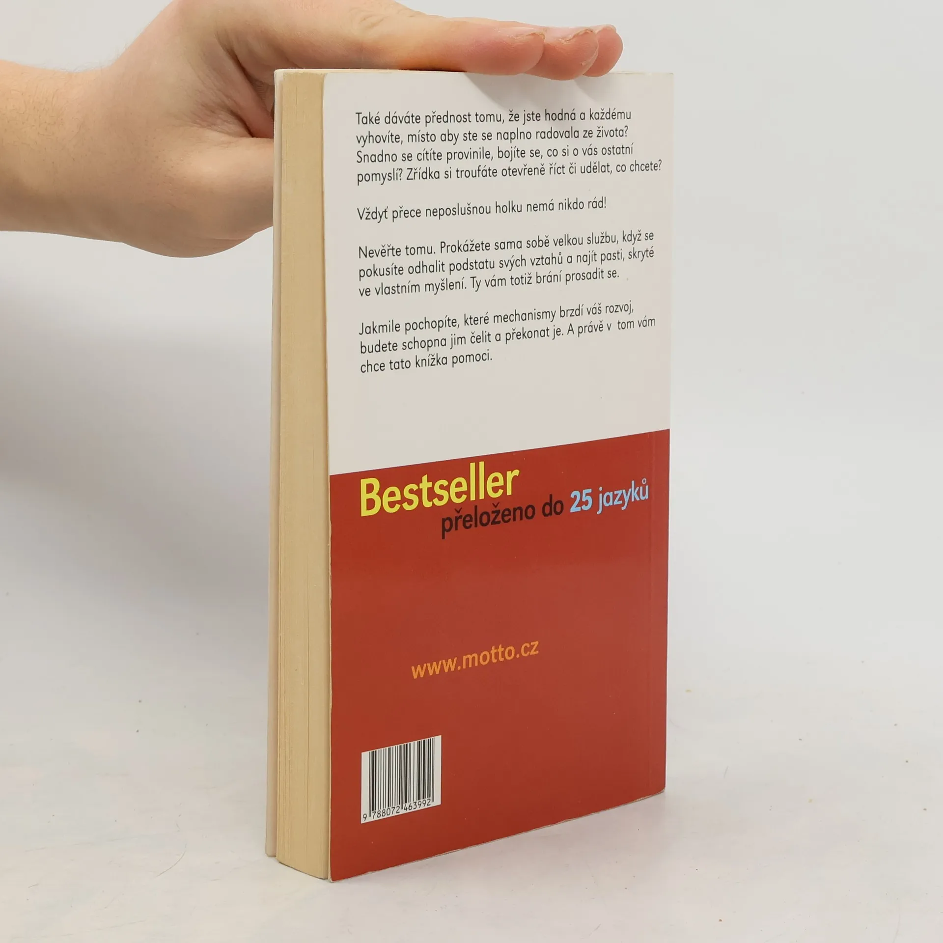 Kniha určená ženám, které se nedokážou prosadit, které jsou hodné a snaží se každému vyhovět, místo aby se naplno radovaly ze života, cítí se provinile a bojí se otevřeně říct či udělat, co chtějí. Autorka ukazuje mechanismy, které brzdí rozvoj žen, odhaluje pasti skryté ve vlastním myšlení a nabízí způsob, jak jim čelit a překonat je. Druhé vydání.