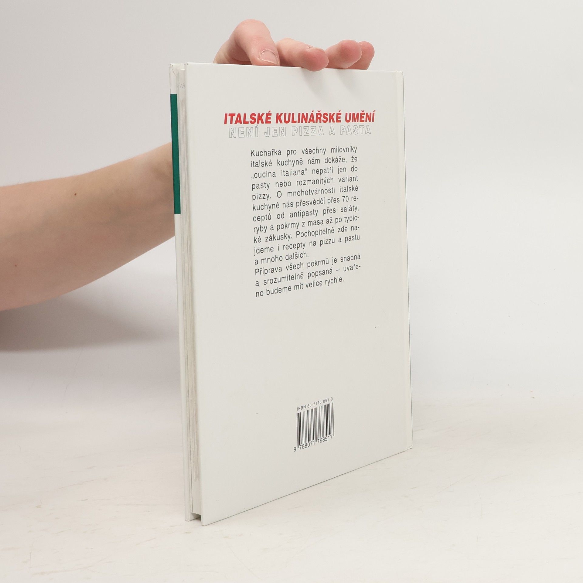 Kuchařka pro všechny milovníky italské kuchyně nám dokáže, že "cucina italiana" nepatří jen do pasty nebo rozmanitých variant pizzy. O mnohotvárnosti italské kuchyně nás přesvědčí přes 70 receptů od antipasty přes saláty, ryby a pokrmy z masa až po typické zákusky. Pochopitelně zde najdeme i recepty na pizzu a pastu a mnoho dalších. Příprava všech pokrmů je snadná a srozumitelně popsaná - uvařeno budete mít velice rychle.