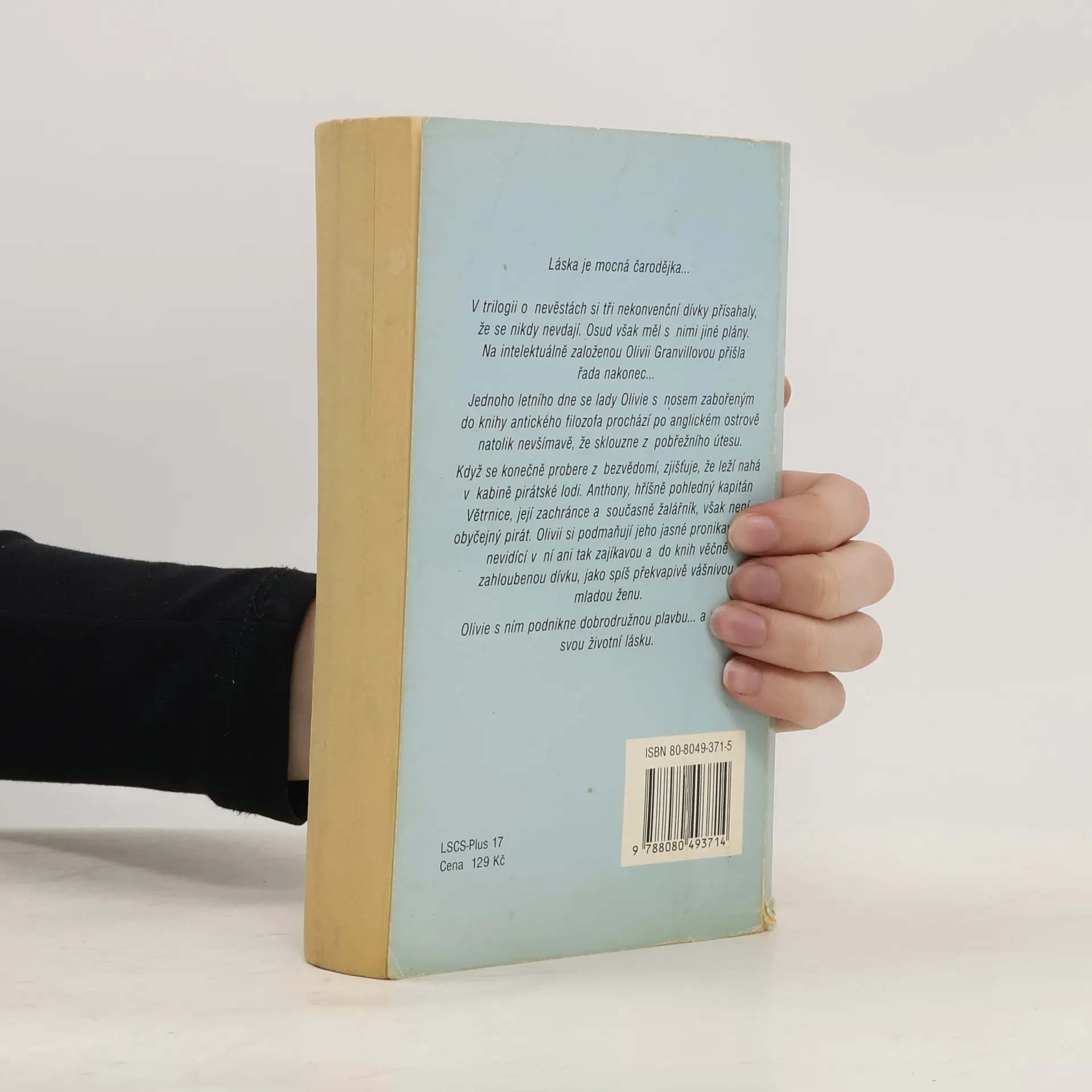 Láska je mocná čarodějka... V trilogii o nevěstách si tři nekonvenční dívky přísahaly, že se nikdy nevdají. Osud však měl s nimi jiné plány. Na intelektuálně založenou Olivii Granvillovou přišla řada nakonec... Jednoho letního dne se lady Olivie s nosem zabořeným do knihy antického filozofa prochází po anglickém ostrově natolik nevšímavě, že sklouzne z pobřežního útesu. Když se konečně probere z bezvědomí, zjišťuje, že leží nahá v kabině pirátské lodi. Anthony, hříšně pohledný kapitán Větrnice, její zachránce a současně žalářník, však není obyčejný pirát. Olivii si podmaňují jeho jasné pronikavé oči, nevidící v ní ani tak zajíkavou a do knih věčně zahloubenou dívku, jako spíš překvapivě vášnivou mladou ženu. Olivie s ním podnikne dobrodružnou plavbu... a nalezne svou životní lásku.