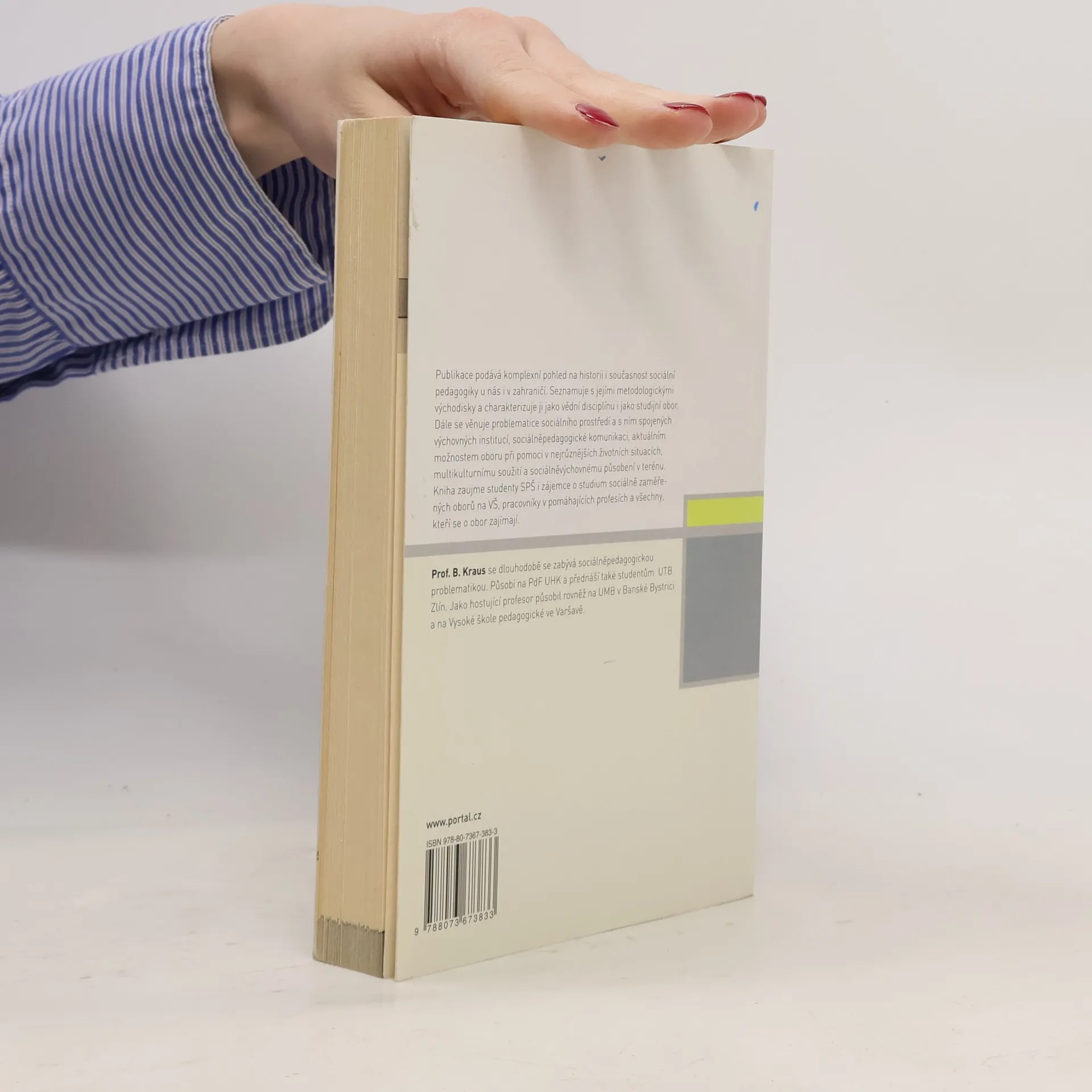 Publikace podává komplexní pohled na historii i současnost sociální pedagogiky u nás i v zahraničí. Seznamuje s jejími metodologickými východisky a charakterizuje ji jako vědní disciplínu i jako frekventovaný studijní obor. Dále se věnuje problematice sociálního prostředí, škole a výchovným institucím z pohledu sociální pedagogiky, sociálněpedagogické komunikaci, aktuálním možnostem oboru při pomoci v nejrůznějších životních situacích, otázkám multikulturního soužití a celé šíři sociálněvýchovného působení v terénu. Kniha zaujme studenty SPŠ i zájemce o studium sociálně zaměřených oborů na VŠ, sociální pracovníky a další zájemce z pomáhajících profesí. Prof. B. Kraus vyučuje na PF UHK a UTB Zlín a je garantem oboru sociální pedagogika na obou uvedených fakultách.