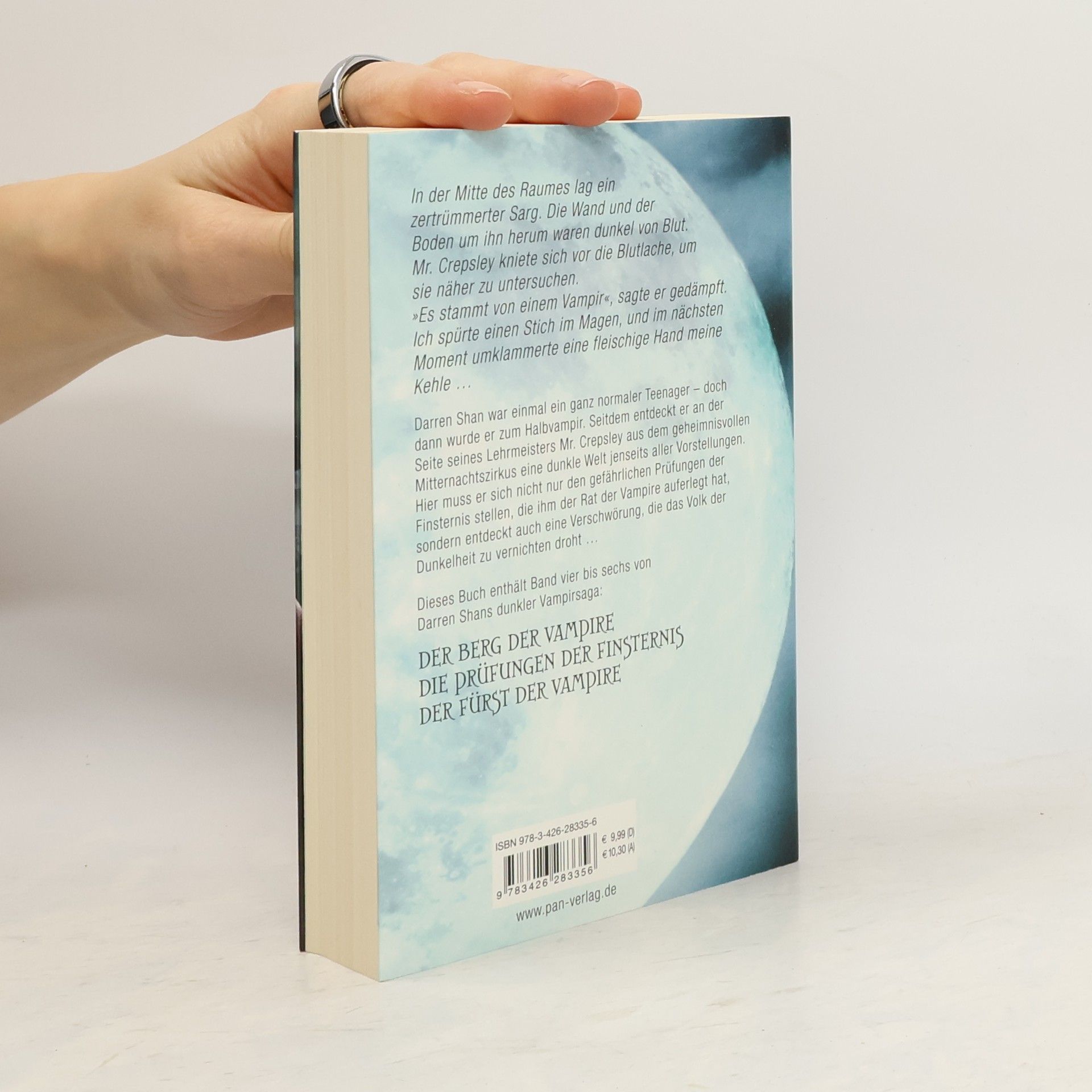 In der Mitte des Raumes lag ein zertrümmerter Sarg. Die Wand und der Boden um ihn herum waren dunkel von Blut. Mr. Crepsley kniete sich vor die Blutlache, um sie näher zu untersuchen. 'Es stammt von einem Vampir', sagte er gedämpft. Ich spürte einen Stich im Magen, und im nächsten Moment umklammerte eine fleischige Hand meine Kehle … Darren Shan war einmal ein ganz normaler Teenager – doch dann wurde er zum Halbvampir. Seitdem entdeckt er an der Seite seines Lehrmeisters Mr. Crepsley aus dem geheimnisvollen Mitternachtszirkus eine dunkle Welt jenseits aller Vorstellungen. Hier muss er sich nicht nur den gefährlichen Prüfungen der Finsternis stellen, die ihm der Rat der Vampire auferlegt hat, sondern entdeckt auch eine Verschwörung, die das Volk der Dunkelheit zu vernichten droht … Dieses Buch enthält Band vier bis sechs von Darren Shans dunkler Vampirsaga: DER BERG DER VAMPIRE DIE PRÜFUNGEN DER FINSTERNIS DER FÜRST DER VAMPIRE