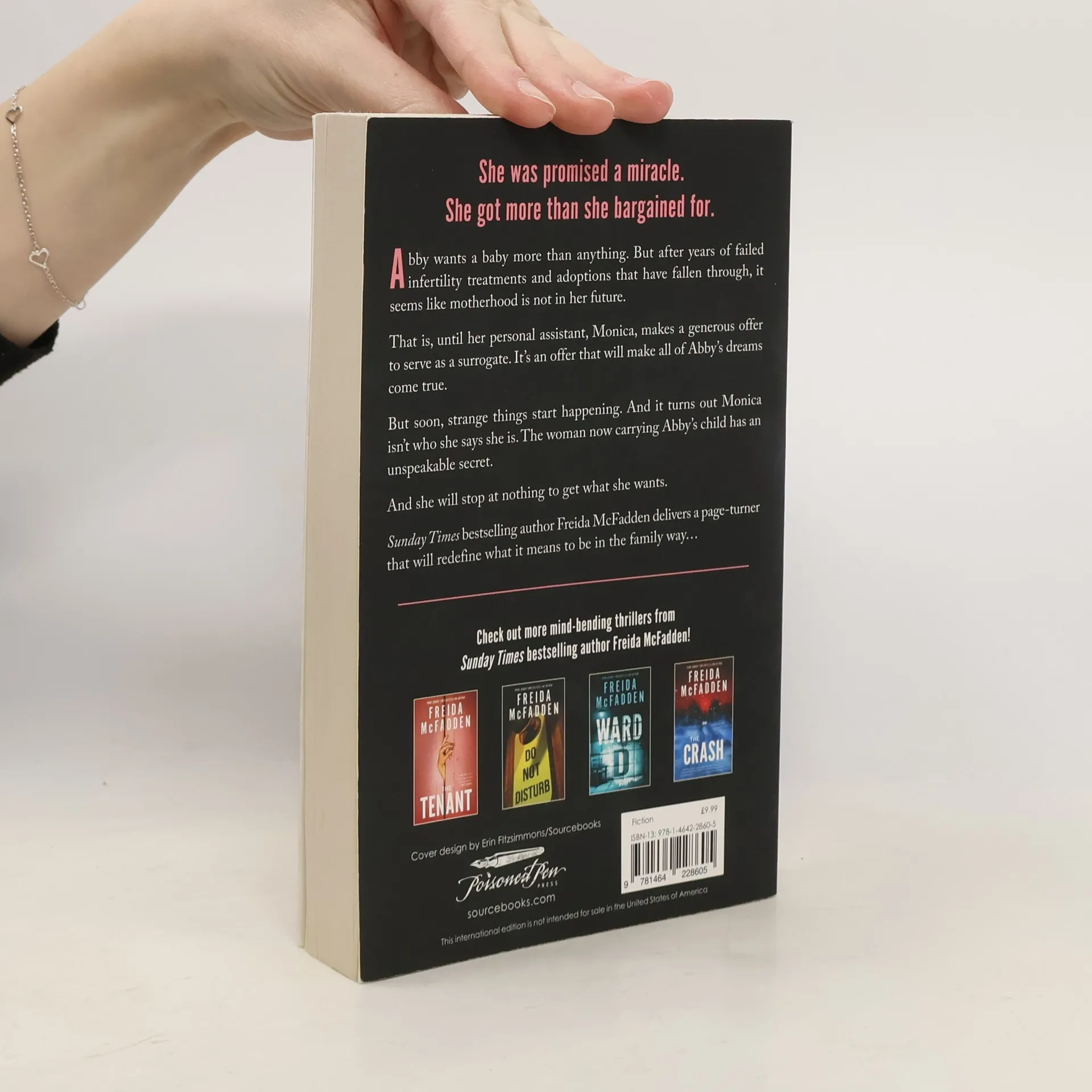 She was promised a miracle. She got more then she bargained for. Abby wants a baby more than anything.But after years of failed infertility treatments and adoptions that have fallen through, it seems like motherhood is not in her future. That is, until her personal assistant Monica makes a generous offer to serve as a surrogate. It’s an offer that will make all of Abby's dreams come true.But soon, strange things start happening. And it turns out Monica isn't who she says she is. The woman now carrying Abby's child has an unspeakable secret.And she will stop at nothing to get what she wants. #1 Sunday Times bestselling author Freida McFadden delivers a page turner that will redefine what it means to be in the family way…