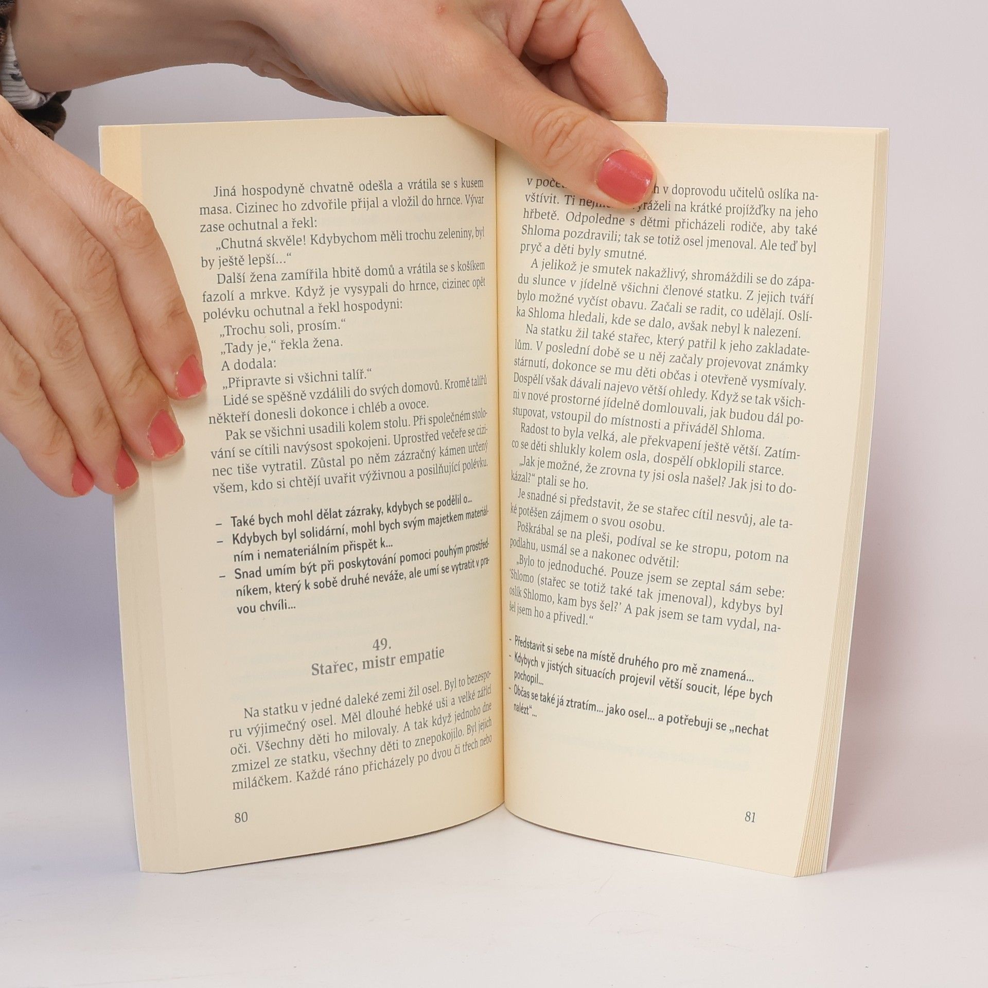 Krátké povídky, které symbolicky i s humorem ukazují na závažné aspekty lidského chování a nesou v sobě nějaké ponaučení. Každý příběh je zakončen několika náměty k vlastnímu zamyšlení, takže je lze použít i pro duchovní cvičení nebo práci ve společenství, v katechezích starších dětí i mládeže.