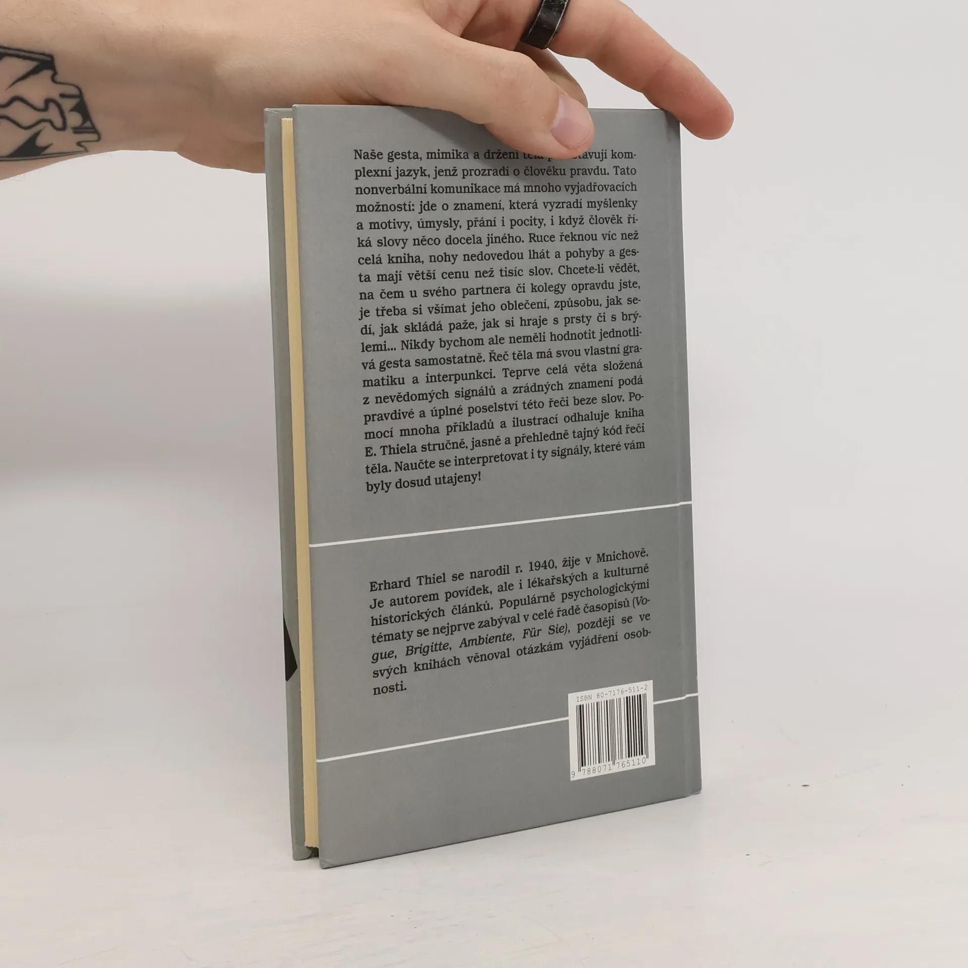 Řeč těla prozradí víc než tisíc slov Naše gesta, mimika a držení těla představují komplexní jazyk, jenž prozradí o člověku pravdu. Tato nonverbální komunikace má mnoho vyjadřovacích možností: jde o znamení, která vyzradí myšlenky a motivy, úmysly, přání i pocity, i když člověk říká slovy něco docela jiného. Ruce řeknou víc než celá kniha, nohy nedovedou lhát a pohyby a gesta mají větší cenu než tisíc slov. Chcete-li vědět, na čem u svého partnera či kolegy opravdu jste, je třeba si všímat jeho oblečení, způsobu, jak sedí, jak skládá paže, jak si hraje s prsty či s brýlemi... Nikdy bychom ale neměli hodnotit jednotlivá gesta samostatně. Řeč těla má svou vlastní gramatiku a interpunkci. Teprve celá věta složená z nevědomých signálu a zrádných znamení podá pravdivé a úplné poselství této řeči beze slov. Pomocí mnoha příkladu a ilustrací odhaluje kniha E. Thiela stručně, jasně a přehledně tajný kód řeči těla. Naučte se interpretovat i ty signály, které vám byly dosud utajeny! Vydání první