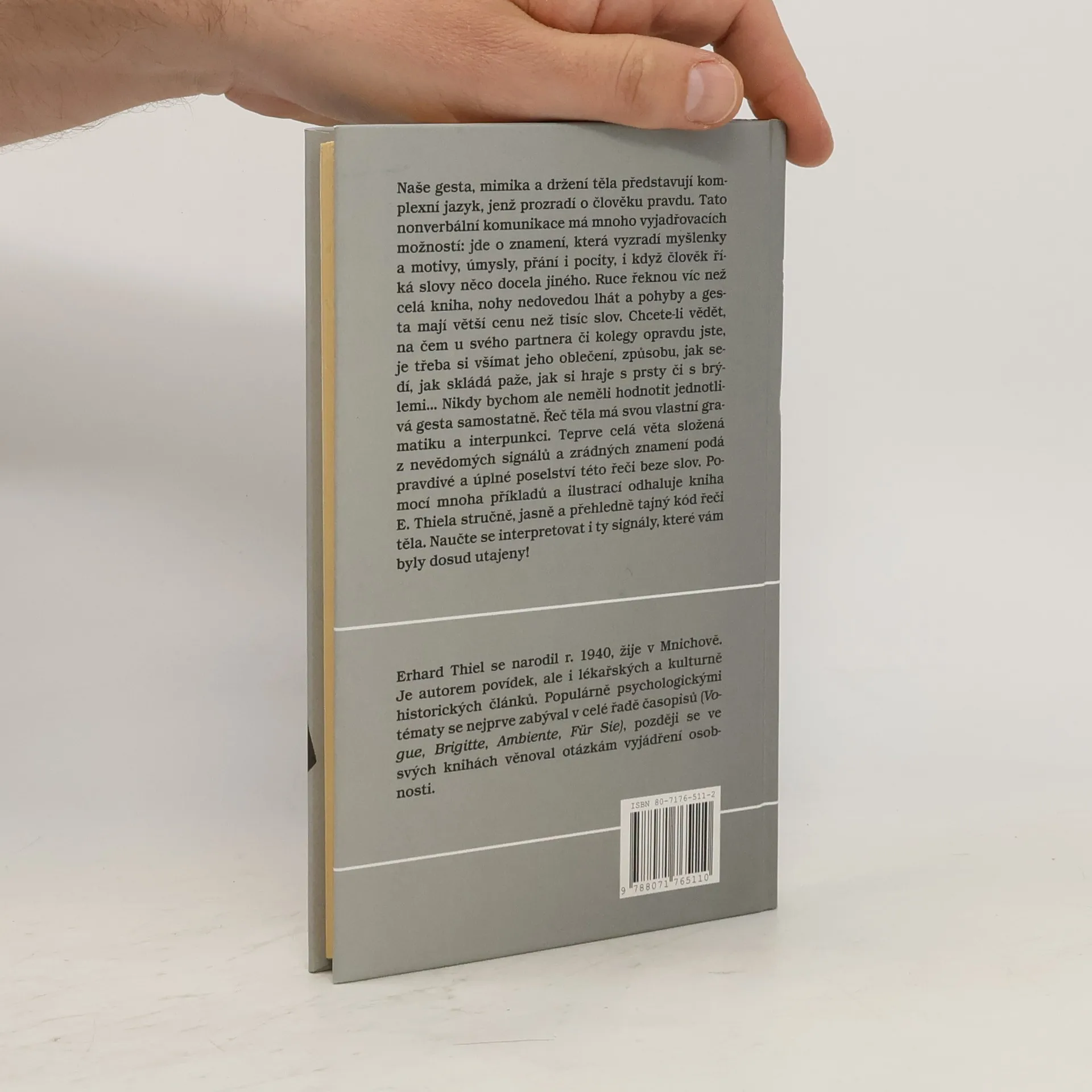 Řeč těla prozradí víc než tisíc slov Naše gesta, mimika a držení těla představují komplexní jazyk, jenž prozradí o člověku pravdu. Tato nonverbální komunikace má mnoho vyjadřovacích možností: jde o znamení, která vyzradí myšlenky a motivy, úmysly, přání i pocity, i když člověk říká slovy něco docela jiného. Ruce řeknou víc než celá kniha, nohy nedovedou lhát a pohyby a gesta mají větší cenu než tisíc slov. Chcete-li vědět, na čem u svého partnera či kolegy opravdu jste, je třeba si všímat jeho oblečení, způsobu, jak sedí, jak skládá paže, jak si hraje s prsty či s brýlemi... Nikdy bychom ale neměli hodnotit jednotlivá gesta samostatně. Řeč těla má svou vlastní gramatiku a interpunkci. Teprve celá věta složená z nevědomých signálu a zrádných znamení podá pravdivé a úplné poselství této řeči beze slov. Pomocí mnoha příkladu a ilustrací odhaluje kniha E. Thiela stručně, jasně a přehledně tajný kód řeči těla. Naučte se interpretovat i ty signály, které vám byly dosud utajeny! Vydání první
