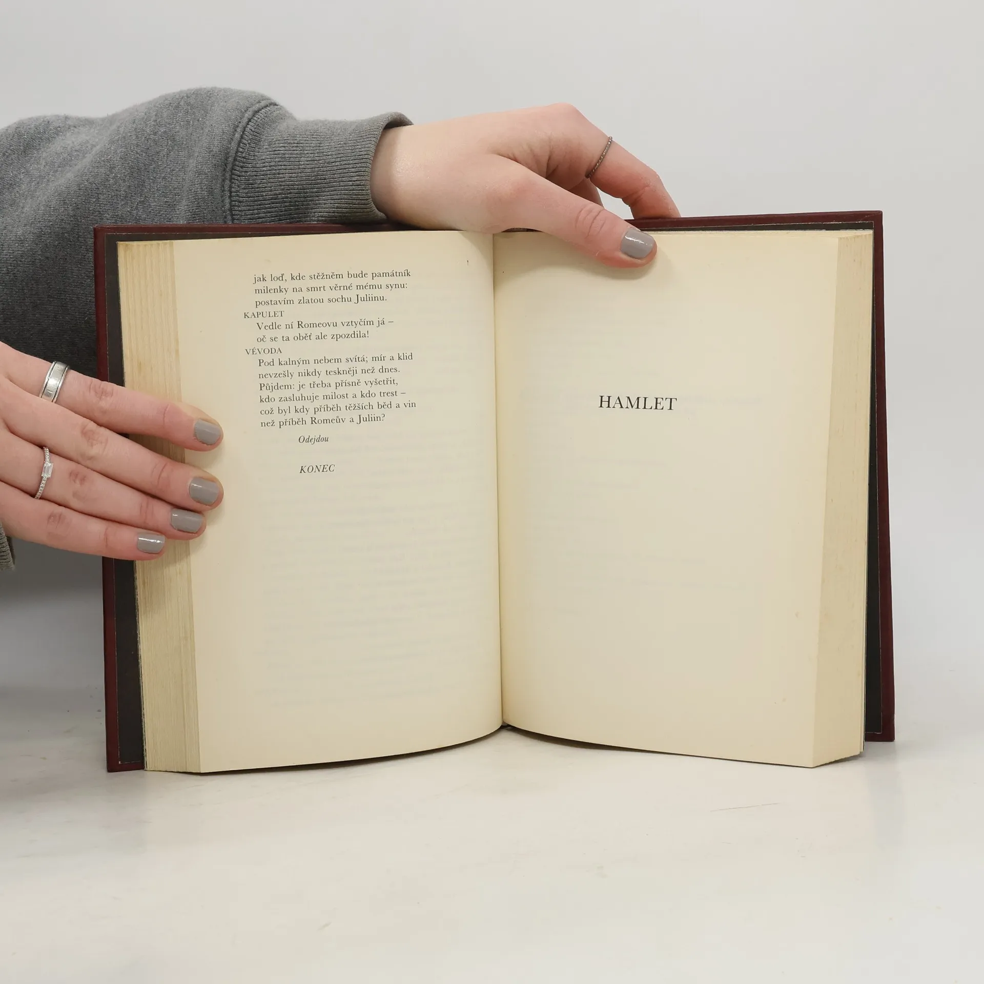 První část knihy uvádí scénář divadelní hry Romeo a Julie, světoznámé tragédie o dvou mladých milencích, kterým v lásce brání soupeření jejich rodů. Ve druhé části knihy nalezneme scénář neméně proslulé divadelní hry Hamlet o dánském kralevici, který se snaží usvědčit svého strýce z vraždy svého otce.