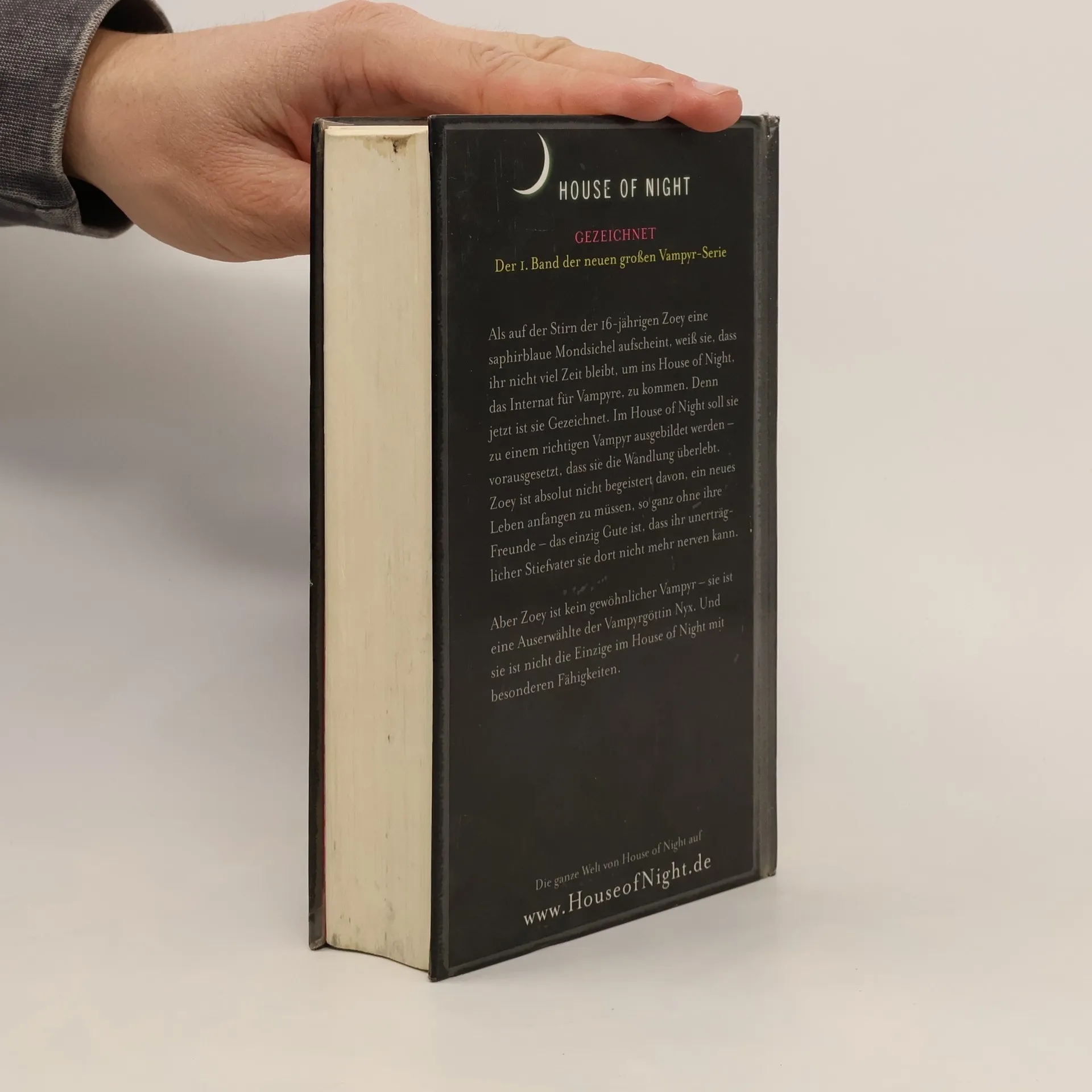Als auf der Stirn der 16-jährigen Zoey eine saphirblaue Mondsichel aufscheint, ist ihr sofort klar, dass sie Gezeichnet worden ist und im House of Night zum Vampyr ausgebildet werden soll. Doch sie ist keine normale Jungvampyrin: Die Göttin Nyx hat sie mit besonderen Kräften versehen. Und Zoey ist nicht die Einzige im Internat mit solchen Fähigkeiten. Als sie herausfindet, dass die Anführerin der Töchter der Dunkelheit, einer Elitegruppe der Schule, ihre Gaben missbraucht, muss sie ihren ganzen Mut aufbringen, um sich ihrer Bestimmung zu stellen … Gezeichnet ist der furiose Auftakt zu Zoeys Entdeckungsreise zwischen den Welten, zwischen Licht und Dunkel und letztendlich zu sich selbst.