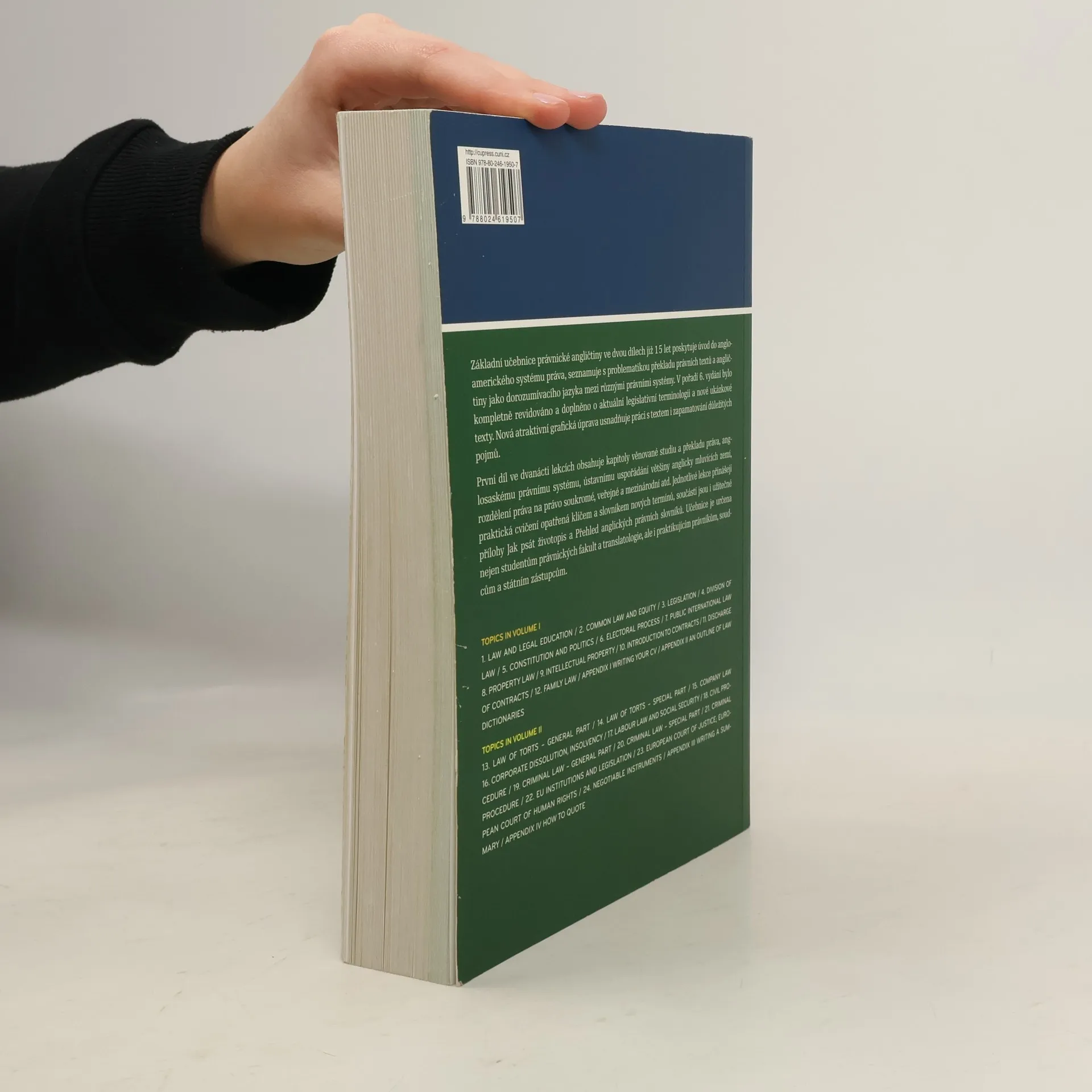 Učebnice právnické angličtiny ve dvou dílech představuje úvod do angloamerického systému práva. První díl ve čtrnácti lekcích seznamuje s ústavním uspořádáním většiny anglicky mluvících zemí, s rozdělením práva na právo soukromým, veřejným a mezinárodním atd. Jednotlivé lekce obsahují mnoho různých cvičení spolu s klíčem a slovníkem nových termínů. Učebnice je určena nejen studentům právnických fakult, ale též i praktikujícím právníkům, soudcům a státním zástupcům.
