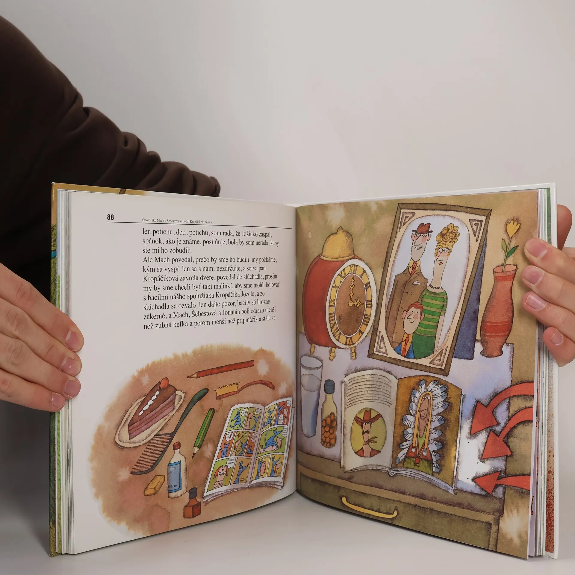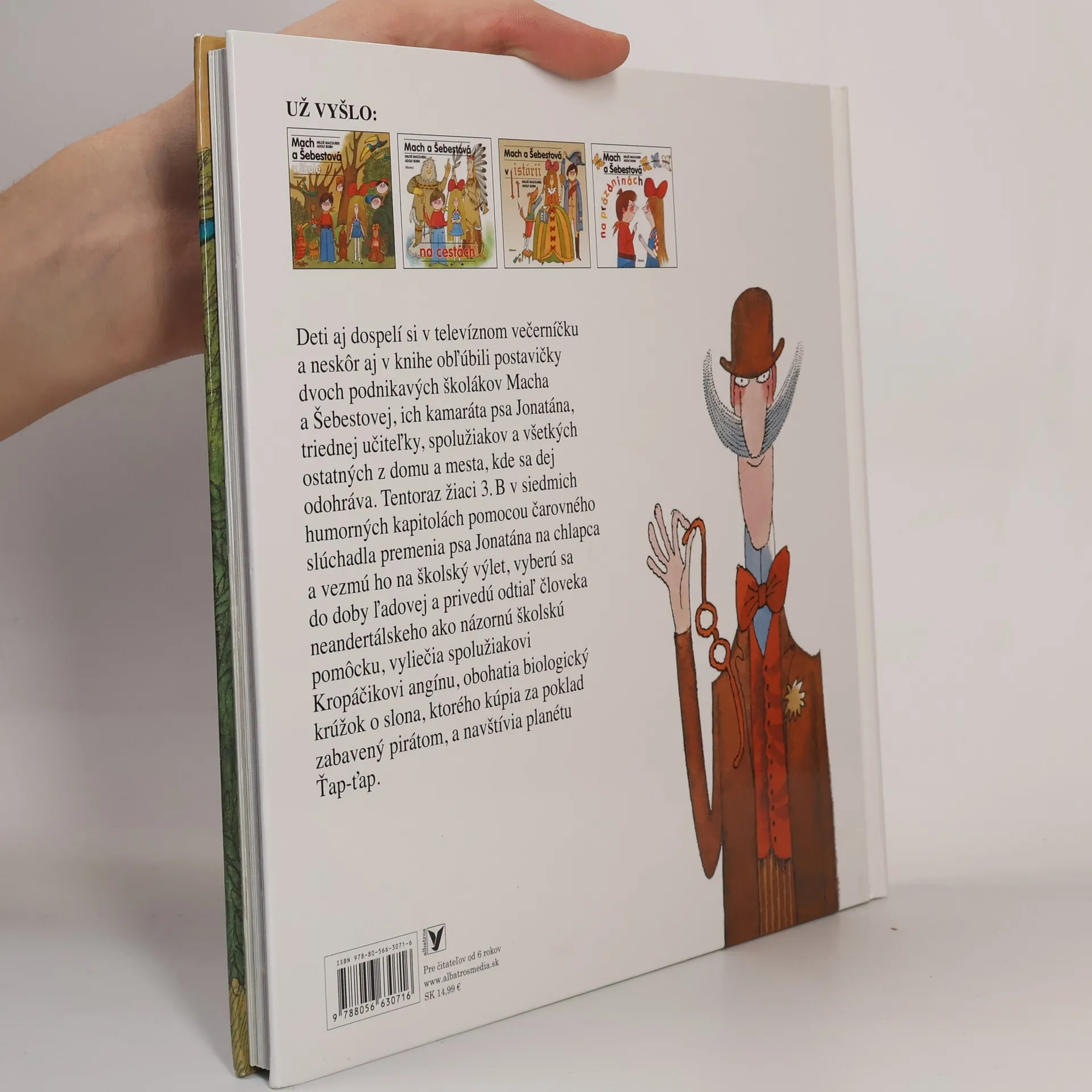 V škole nemusí byť nuda... Deti aj dospelí si v televíznom večerníčku a neskôr aj v knihe obľúbili postavičky dvoch podnikavých školákov Macha a Šebestovej, ich kamaráta psa Jonatána, triedne učiteľky, spolužiakov a všetkých ostatných z domu a mesta, kde sa dej odohráva. Tentoraz žiaci 3.B v siedmich humorných kapitolách pomocou čarovného slúchadla premenia psa Jonatána na chlapca a vezmú ho na školský výlet, vyberú sa do doby ľadovej a privedú odtiaľ človeka neandertálskeho ako názornú školskú pomôcku a zažijú mnoho ďalších príhod.